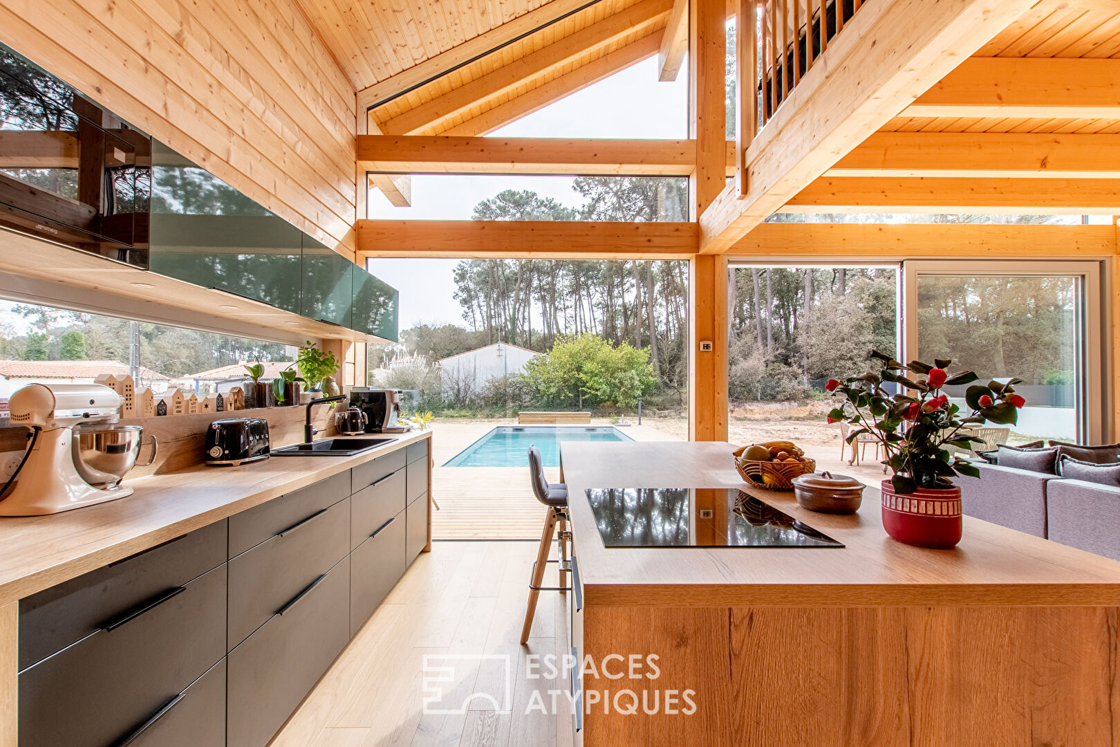 Sur la commune de Jard-sur-Mer, cette superbe maison en bois d’inspiration scandinave, implantée sur une parcelle de 1730m², se déploie sur 120 m² environ.