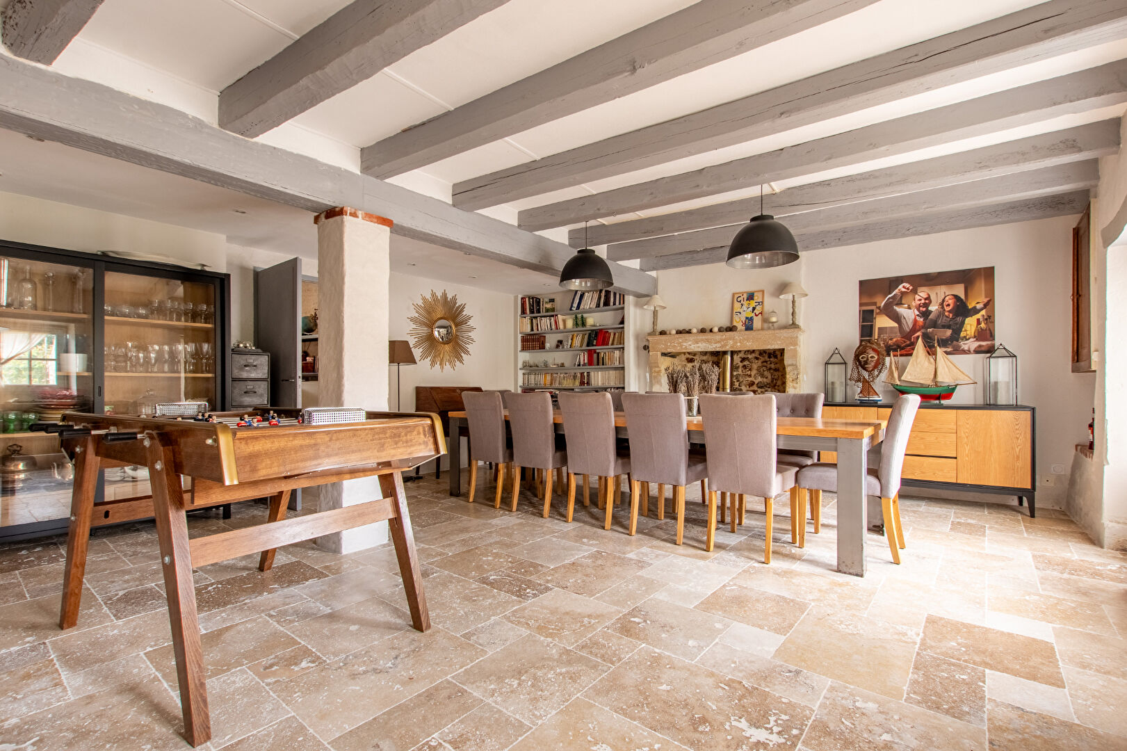 Le rez-de-chaussée s’articule autour d’une cuisine alliant harmonieusement des éléments modernes et des pierres apparentes. De chaque côté de la cuisine, se trouve un salon chaleureux et une vaste salle à manger pouvant aisément accueillir une douzaine de convives. Ces deux pièces sont dotées de cheminées d’époque et de belles poutres au plafond. La salle à manger donne également accès à un second salon. À l’exception d’un salon pavé de tomettes anciennes, le sol de toutes les pièces du rez-de-chaussée est recouvert d’un magnifique travertin.