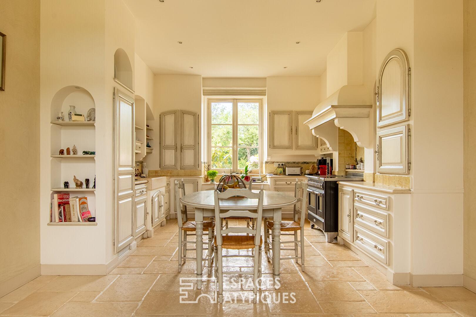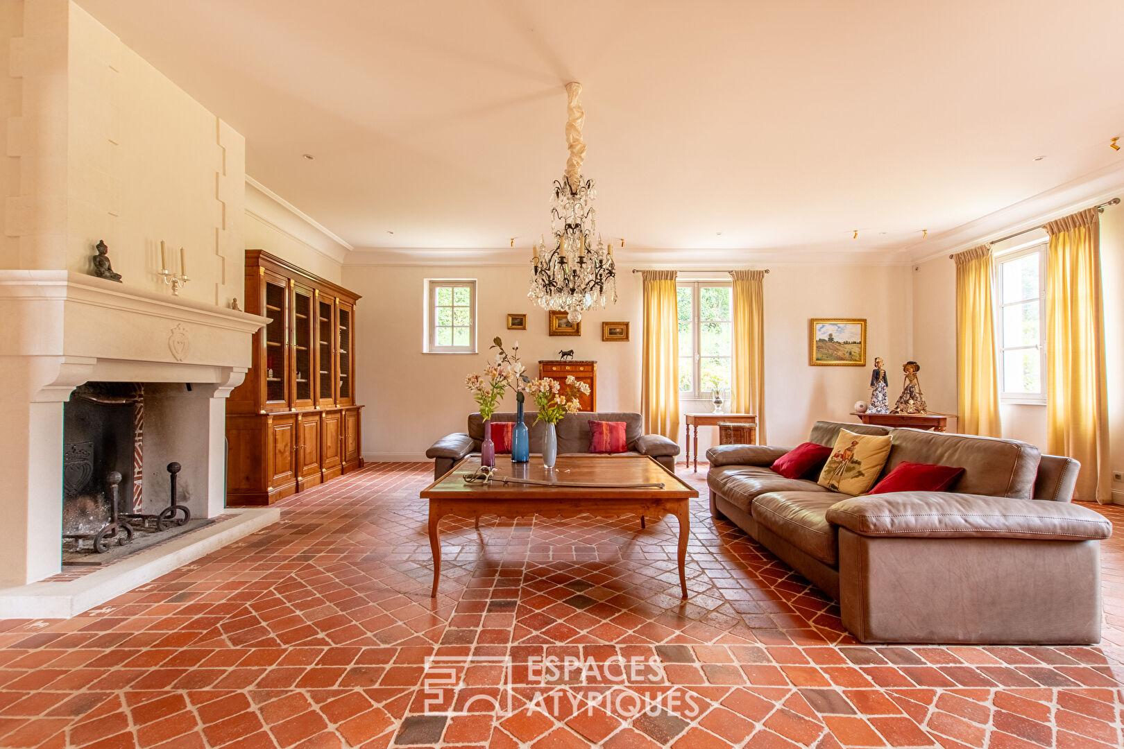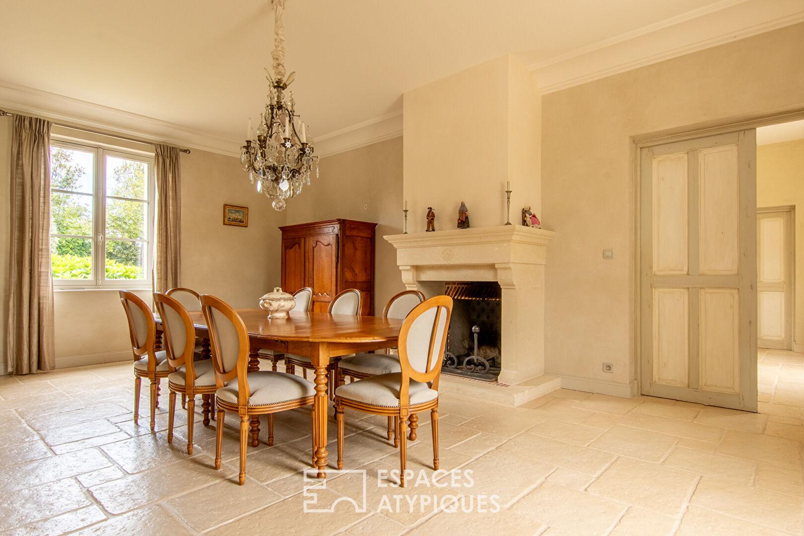 Le sol de ces deux pièces est pavé de dalle qui contrastent avec les tomettes des salons, évoquant un style différent, comme si la construction de la propriété s’était étalée sur plusieurs époques. La salle à manger offre de belles proportions et dispose de sa cheminée en pierre.