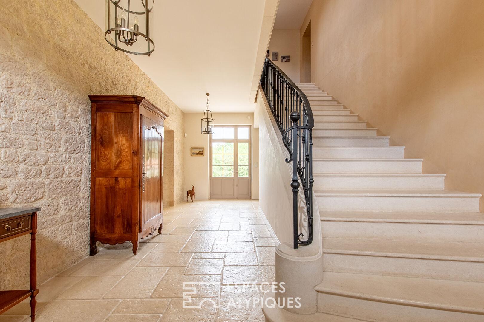 Dès l’entrée, le charme opère, grands volumes, majestueux escalier en pierre avec son garde-corps en fer forgé, dalle en opus romain au sol ce large hall dessert d’un côté deux salons, et de l’autre une salle à manger, une cuisine et son arrière cuisine.