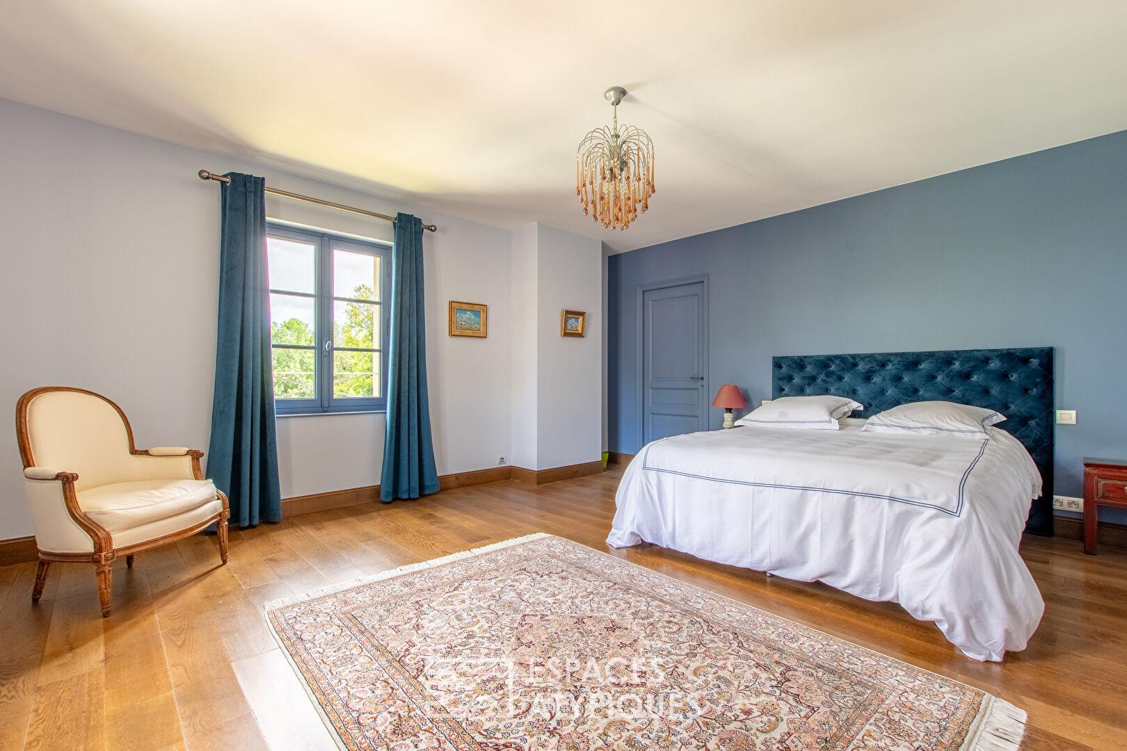 Le terme suite prend ici tout son sens pour désigner l’espace parentale. Un premier vestibule distribue l’accès à la chambre, au dressing, et à un cabinet de toilette privé. Une belle salle de bain dont le sol et les murs sont revêtus de travertin, est accessible depuis la chambre et le dressing. Les surfaces de chaque pièce sont impressionnantes. A l’étage, les sols des chambres et du palier sont couverts de tomettes ou de parquet.