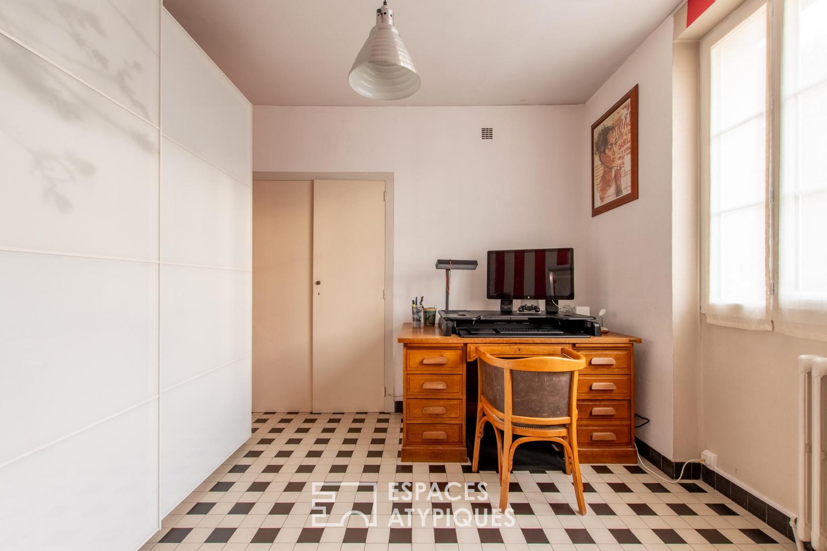 L’entrée révèle immédiatement le cachet de la demeure avec son carrelage ancien rétro et son escalier authentique en bois. Le rez-de-chaussée s’articule autour d’un salon-séjour traversant, baigné de lumière naturelle, où une cheminée en marbre apporte une élégance intemporelle. Une cuisine indépendante récente, équipée et fonctionnelle, facilite le quotidien. Ce niveau est complété par un second salon bibliothèque ainsi qu’un bureau, parfaits pour le télétravail ou la détente.