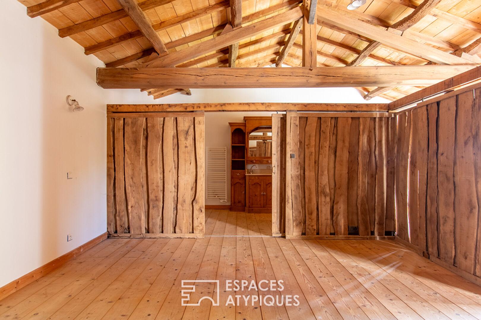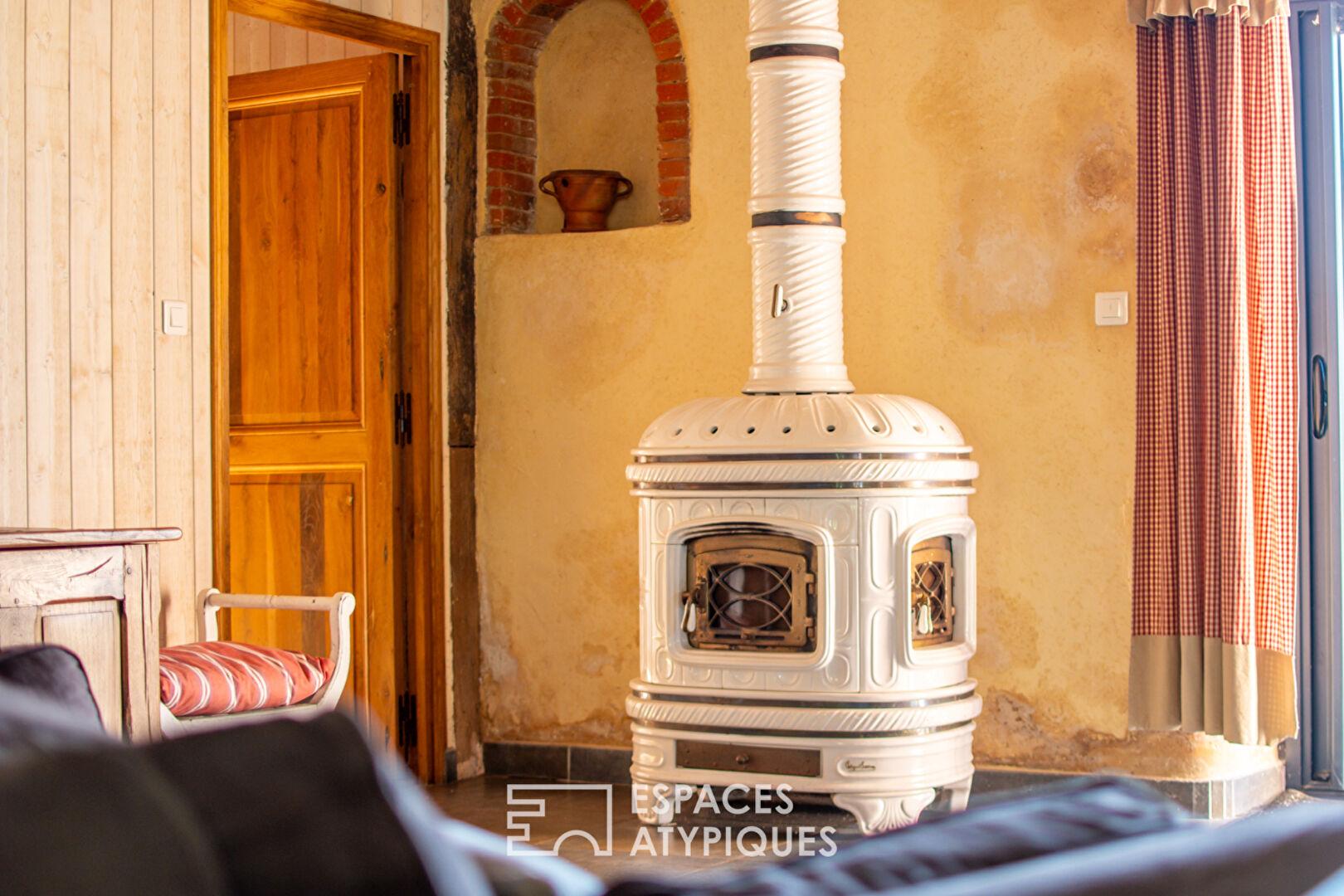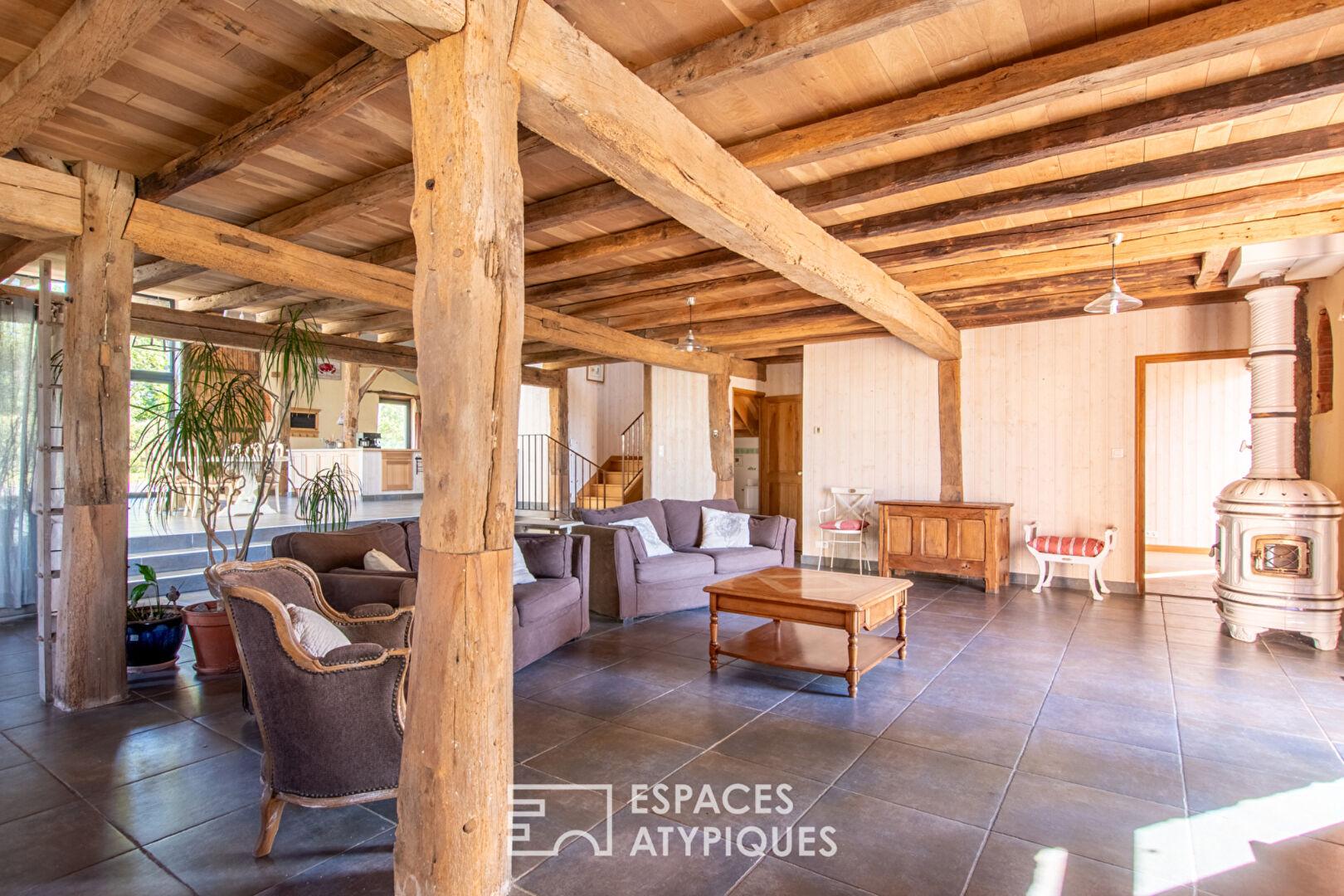 Sous une charpente cathédrale apparente, la cuisine ouverte et le salon-séjour avec poêle à bois bénéficient d’une luminosité traversante grâce à d’anciennes ouvertures sublimées.