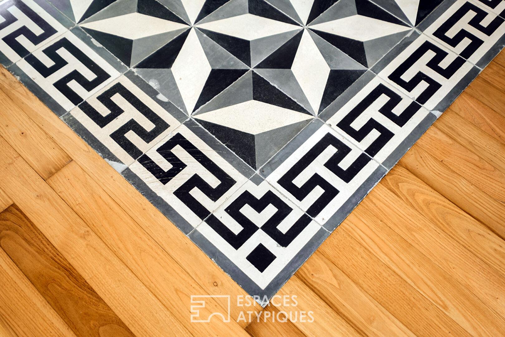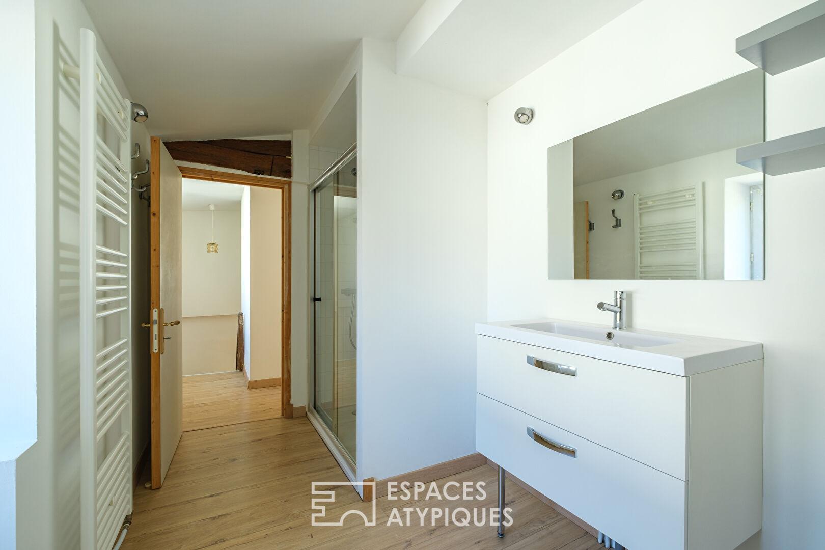 À l’étage, le palier distribue deux chambres au cachet préservé, pensées comme des refuges intimistes, complétées par une salle d’eau aux lignes épurées. L’agencement, fluide et optimisé, sublime les volumes pour créer une atmosphère de cocon urbain, à la fois feutrée et graphique.