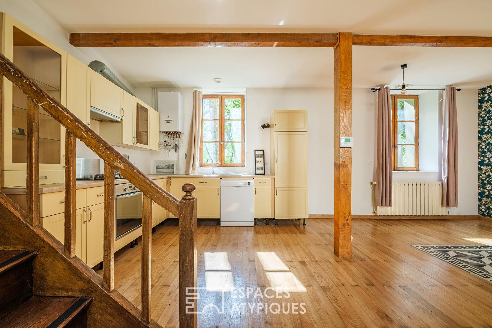 Le rez-de-chaussée dévoile une pièce de vie baignée de lumière où le parquet d’origine dialogue avec une décoration soignée. Ici, la cuisine aménagée s’efface avec élégance derrière l’espace de réception. Les fenêtres, véritables percées visuelles, cadrent la végétation du parc comme des oeuvres d’art vivantes en perpétuelle mutation.