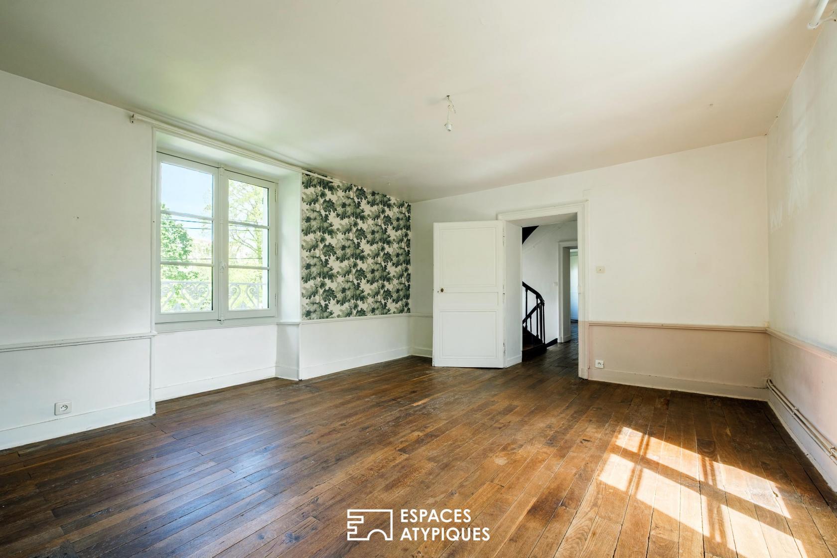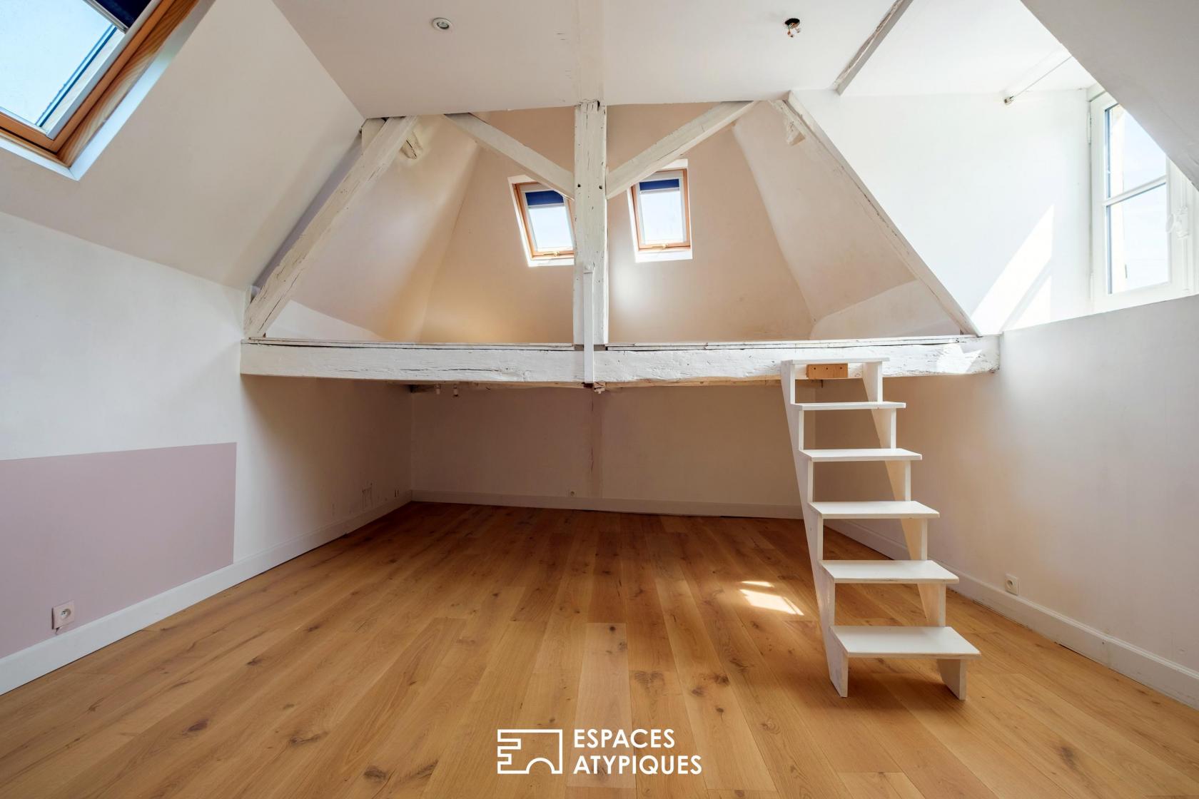 L’intérieur séduit par ses volumes généreux et son agencement polyvalent. Le rez-de-chaussée, dédié à la réception, s’articule autour d’un salon surélevé et d’une salle à manger de caractère, tous deux ornés de cheminées anciennes et de parquets d’origine. La cuisine aménagée, véritable coeur de l’extension, s’ouvre sur le jardin via de superbes verrières, créant un dialogue permanent avec la nature. Les étages supérieurs dévoilent un espace nuit foisonnant : deux grandes chambres de maître occupent le premier niveau, complétées par deux bureaux baignés de lumière dans l’extension, transformables selon les envies. Le deuxième étage abrite deux chambres supplémentaires sous poutres apparentes, tandis que le dernier niveau cache une pièce de jeux, offrant un refuge poétique sous les toits.