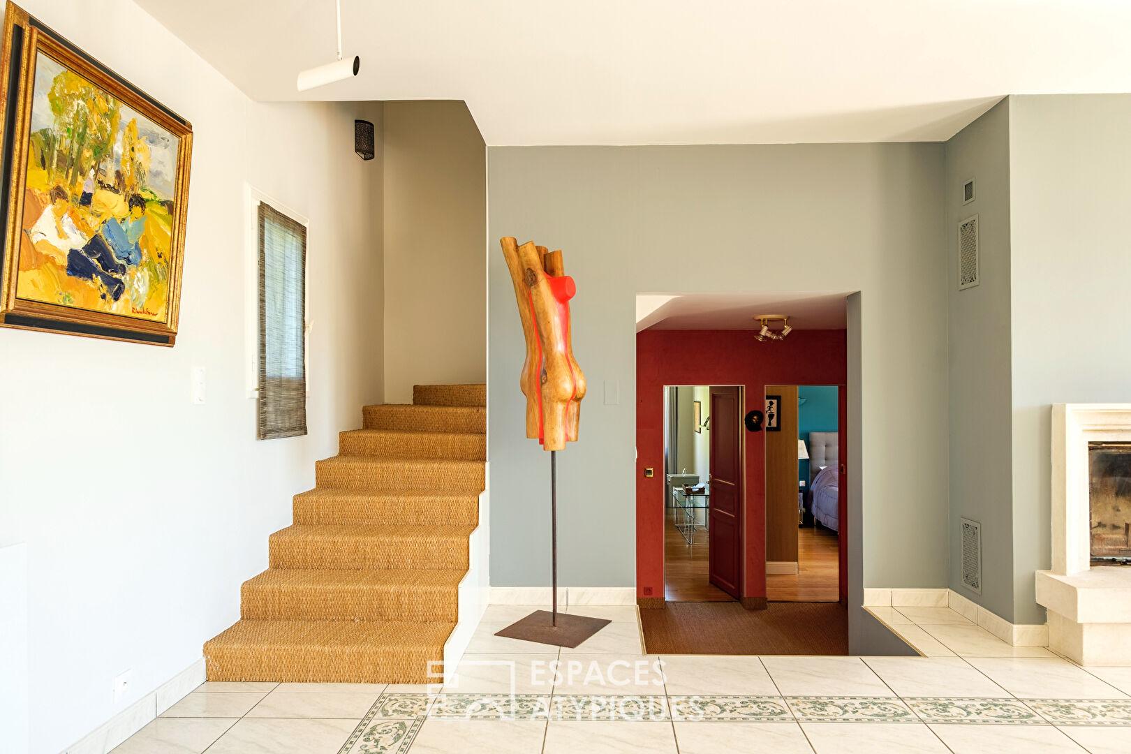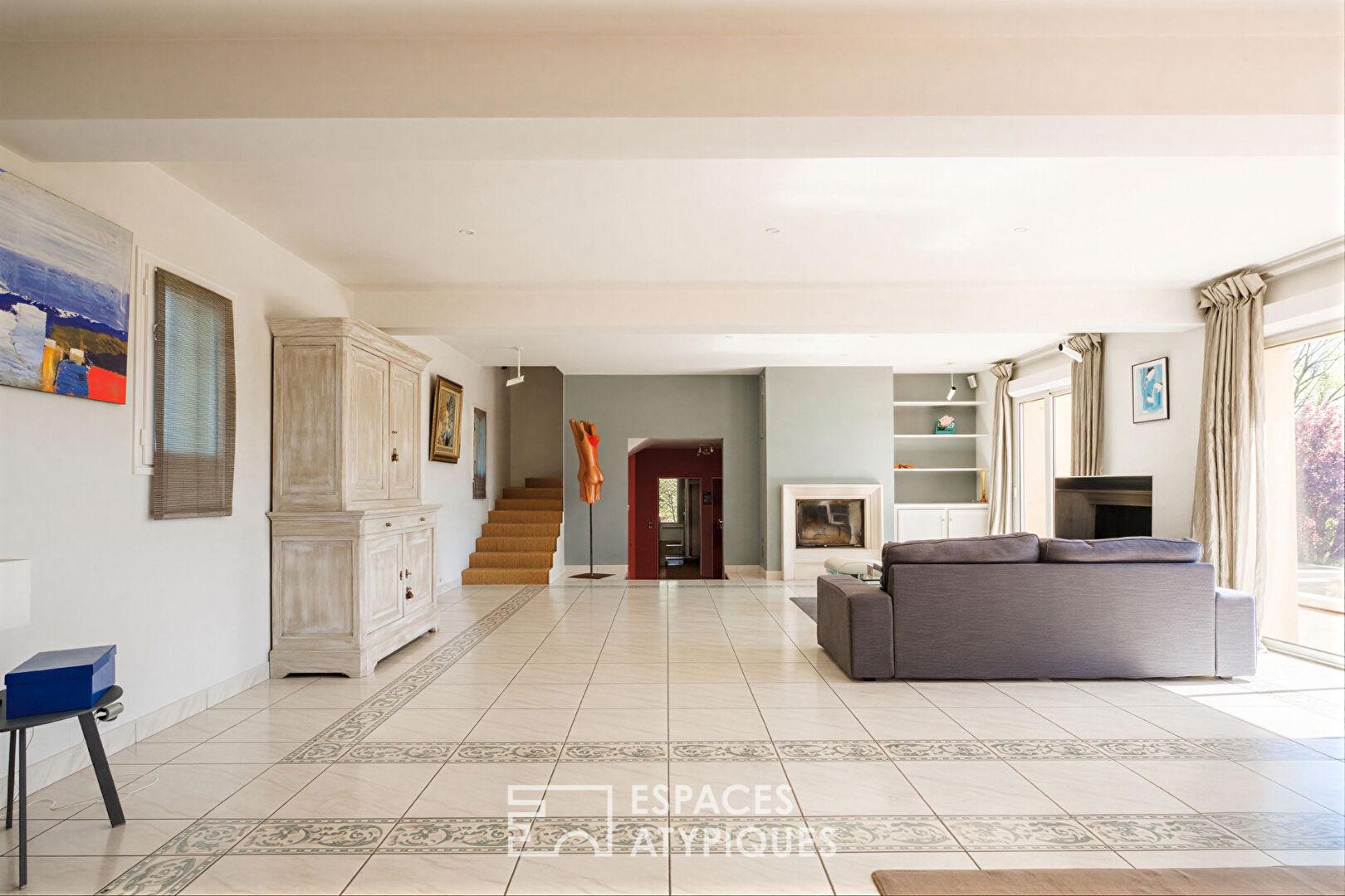 L’entrée conduit à une pièce de vie lumineuse de 65 m2 avec cheminée, largement ouverte sur l’extérieur. La cuisine aménagée communique avec une salle de musique de 40 m2, espace agrémenté d’un bar et d’un parquet chaleureux. Le rez-de-chaussée accueille également trois chambres, dont deux suites, tandis qu’à l’étage, le palier dessert deux chambres additionnelles. Un triple garage, un atelier et une cave voûtée complètent les prestations de cette demeure aux lignes soignées.