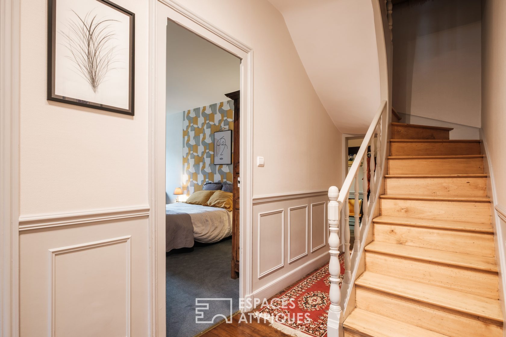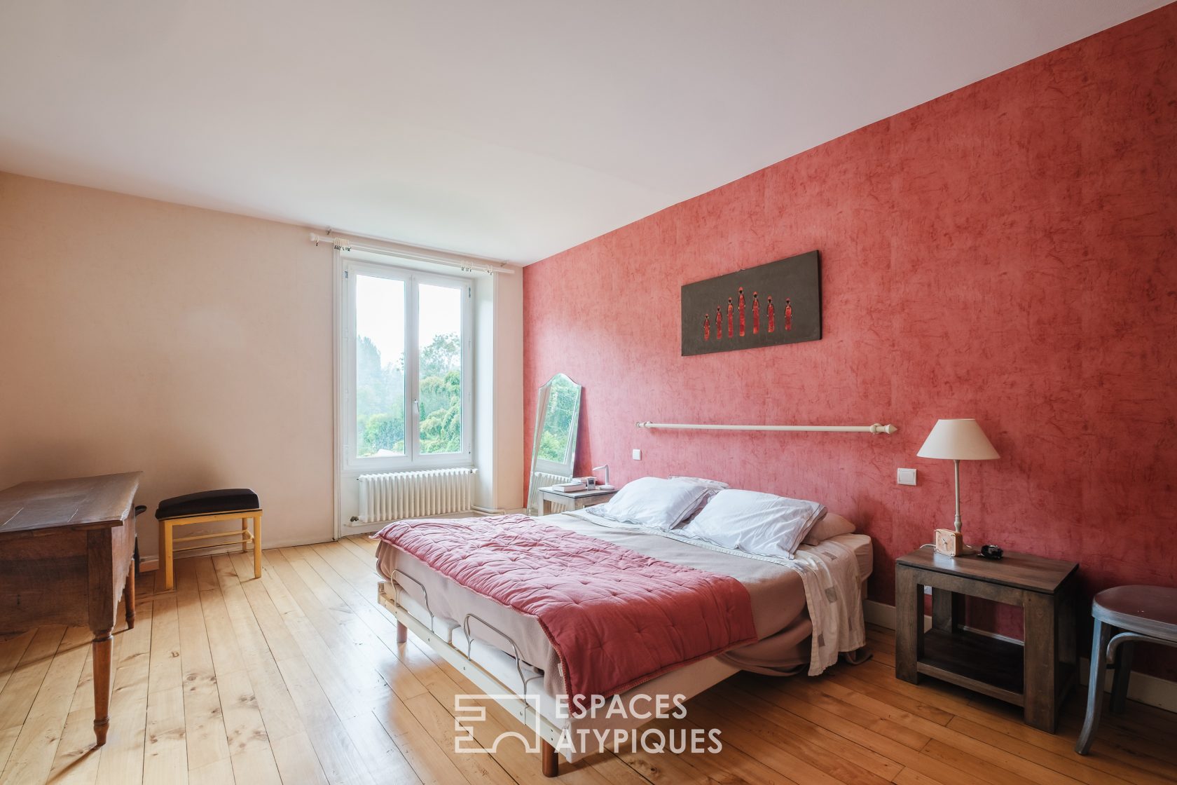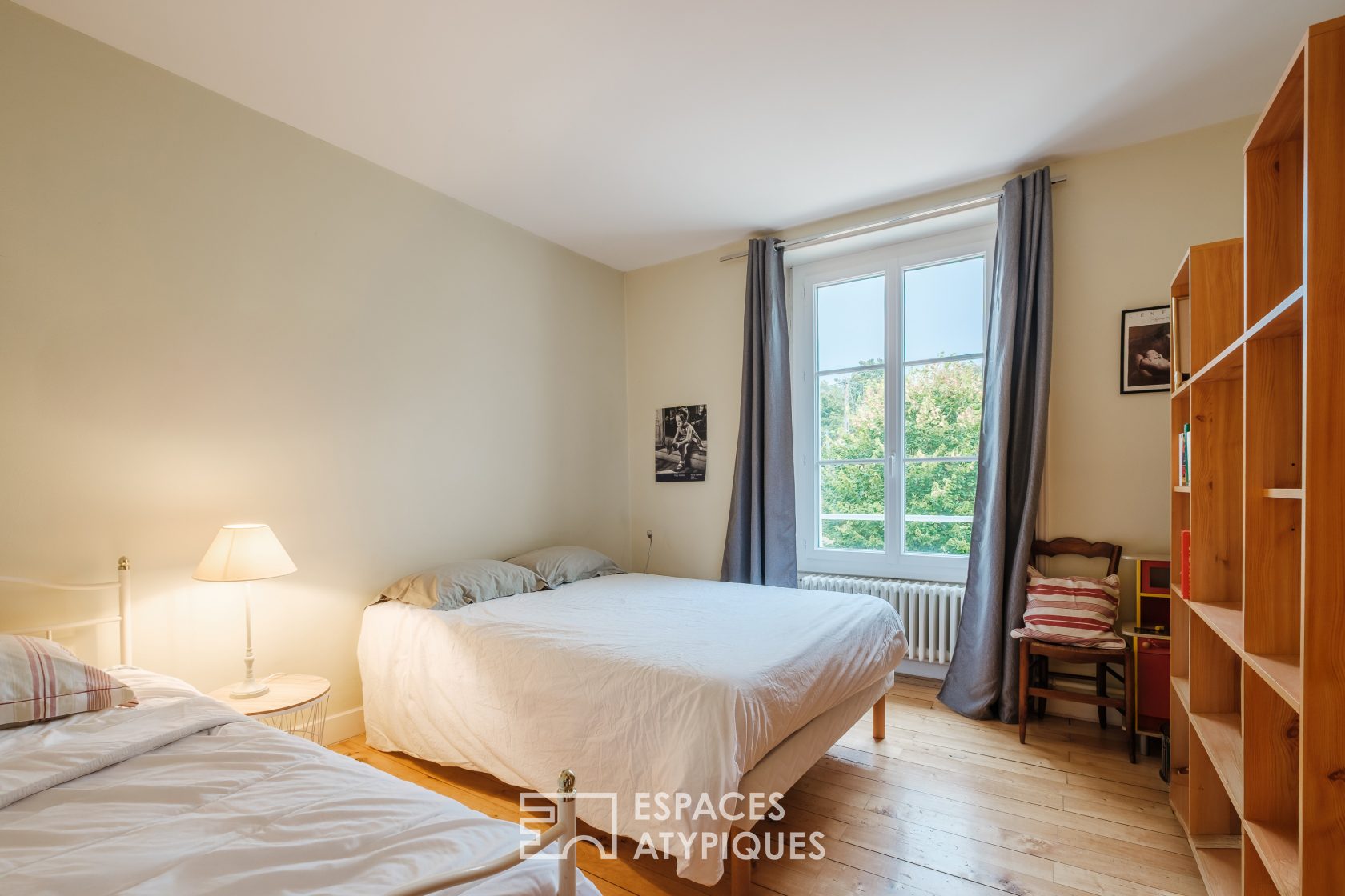 À l’étage, un dégagement dessert deux grandes chambres, chacune bénéficiant d’un dressing, ainsi qu’une salle d’eau avec WC.