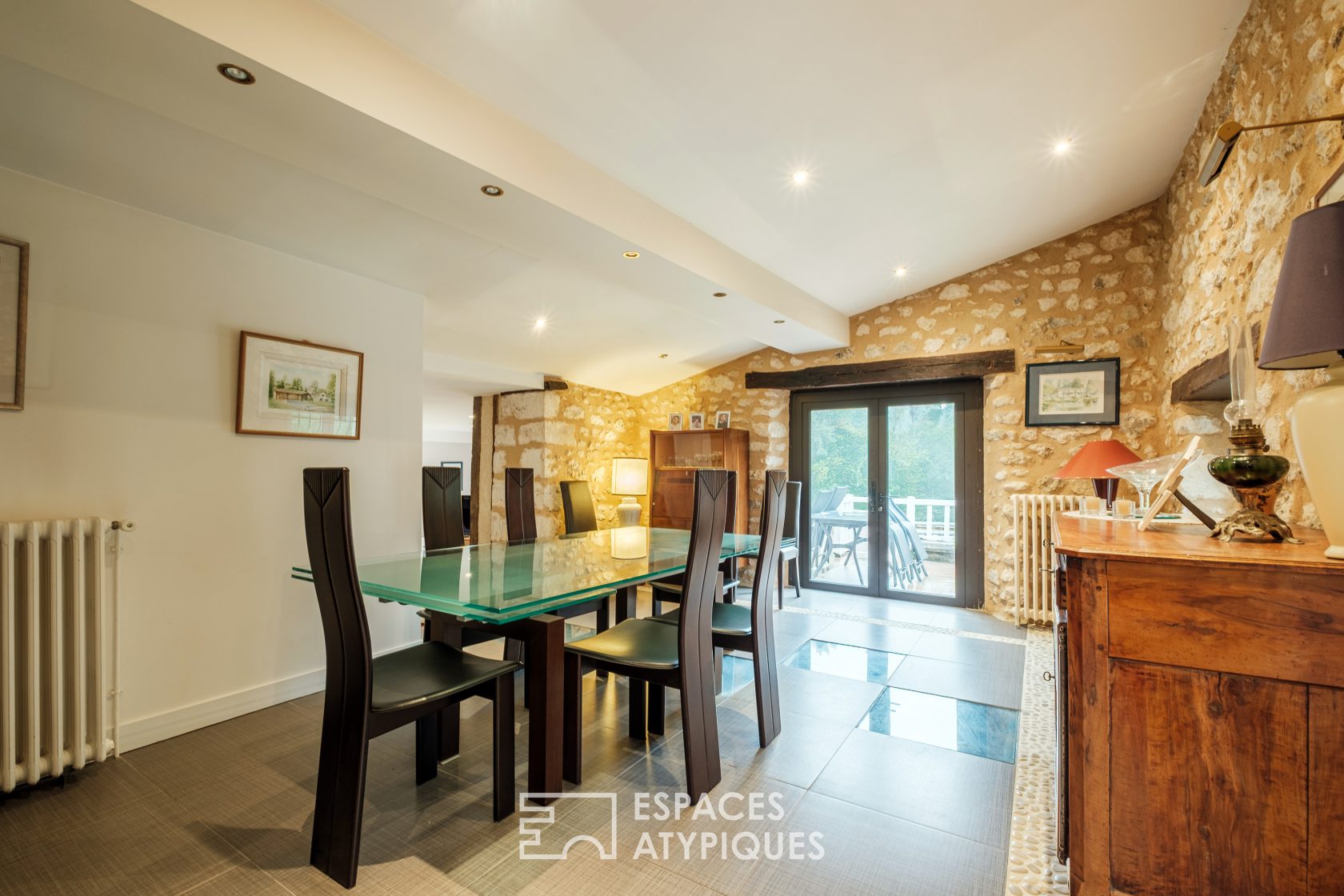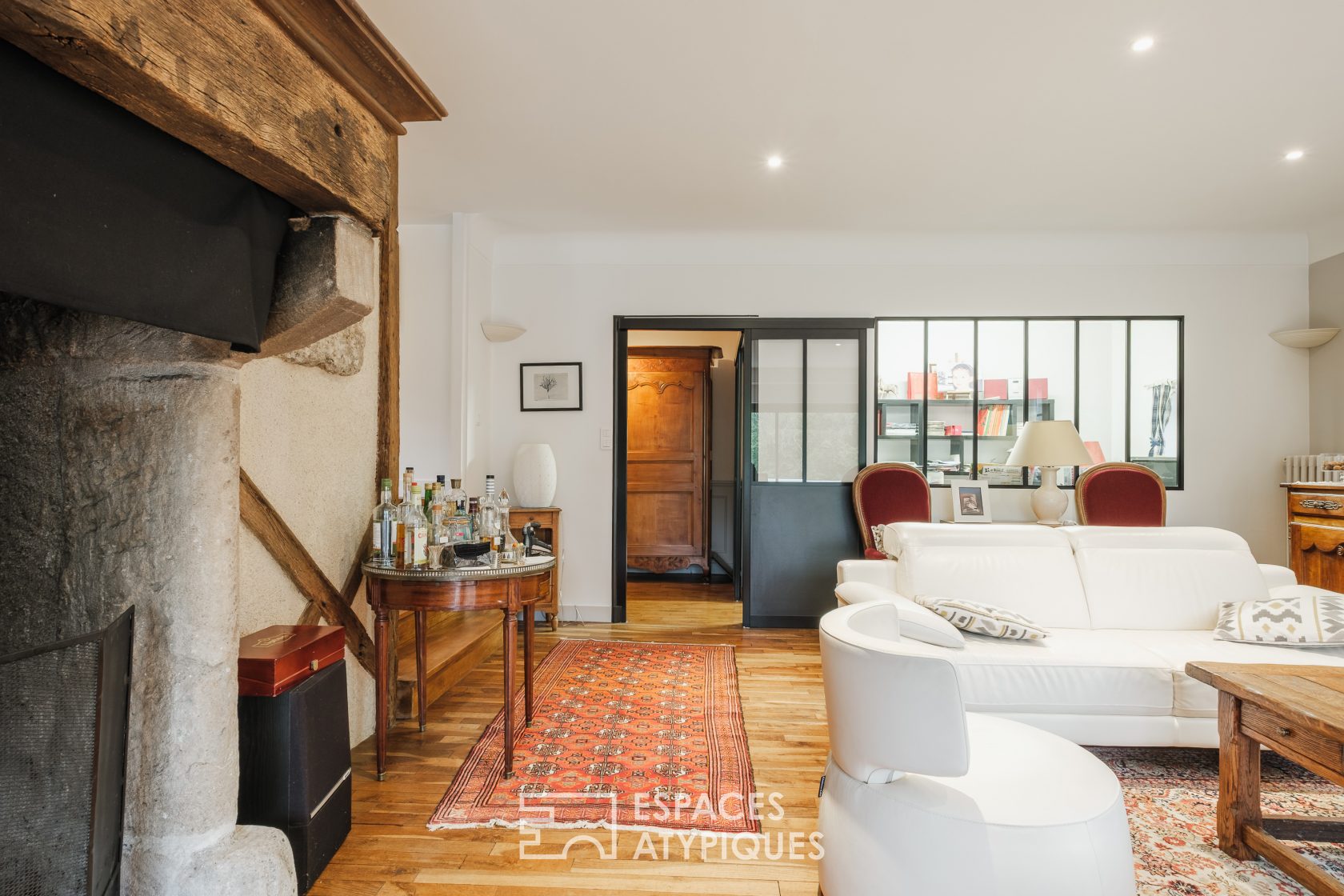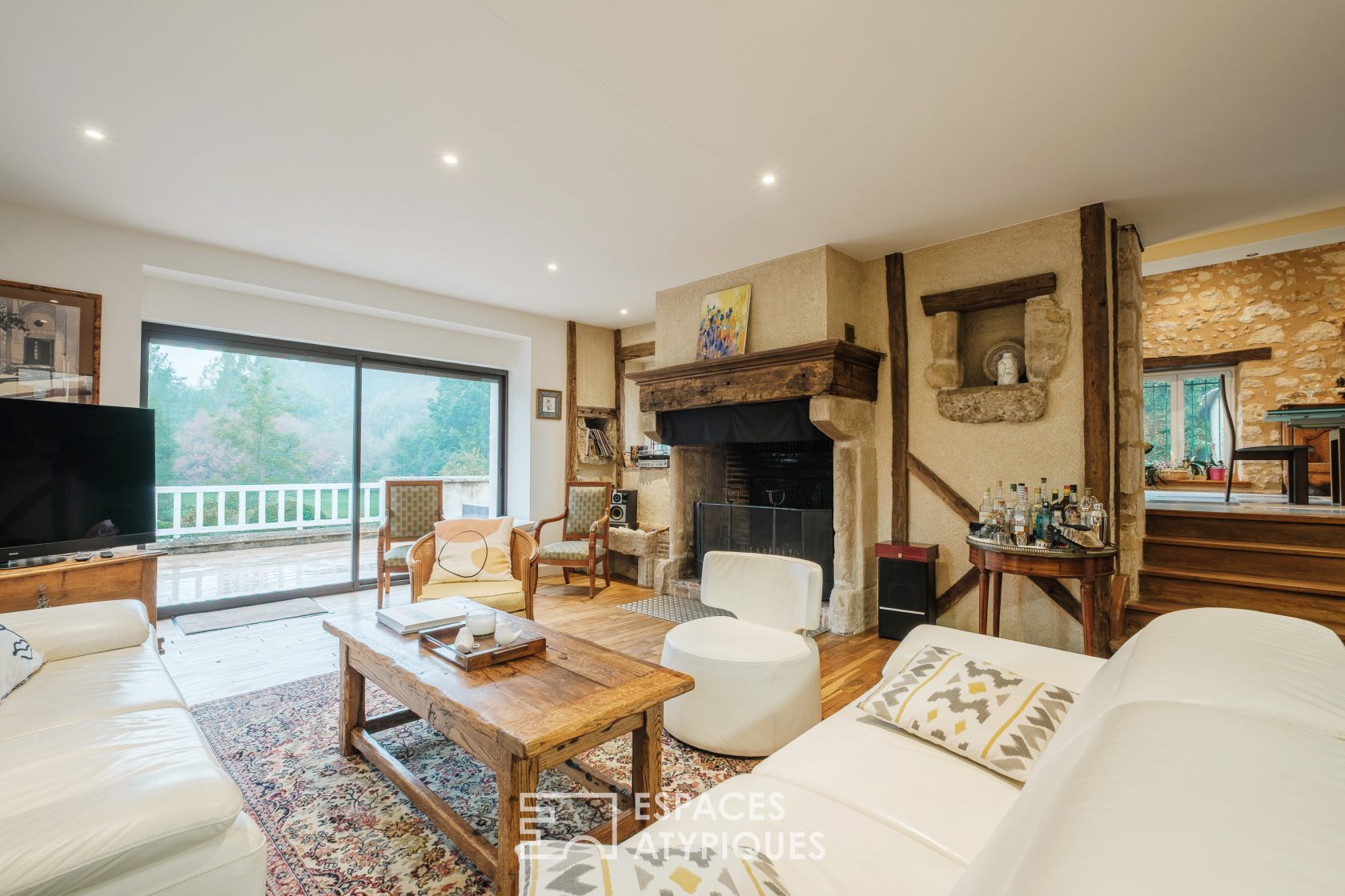 La rénovation de cette propriété a su conserver le charme de l’ancien tout en y intégrant un confort moderne. Le rez-de-chaussée dispose de pièces à vivre confortables : la cuisine équipée et son coin repas du quotidien mène au séjour qui profite d’une vue étonnante sur la roue du moulin. Le salon, chaleureux et orné d’une imposante cheminée d’époque, dévoile une vue fascinante sur la nature environnante. Ce niveau dispose également d’un bureau, d’une suite parentale complète avec chambre et salle d’eau, et de pièces de service.