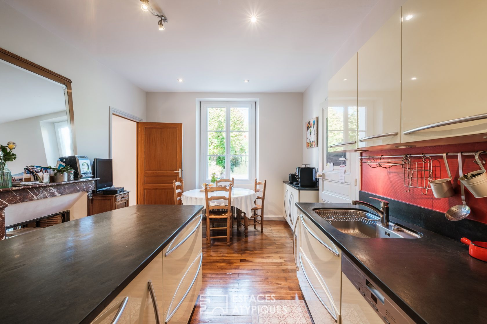 Les parquets anciens et les tomettes confèrent un cachet indéniable à l’ensemble des pièces. Le rez-de-jardin, d’une surface équivalente à celle de la maison, est compartimenté en cinq pièces idéales pour le stockage ou les activités de bricolage, dont l’une abrite la chaufferie et une autre révèle la majestueuse roue du moulin.