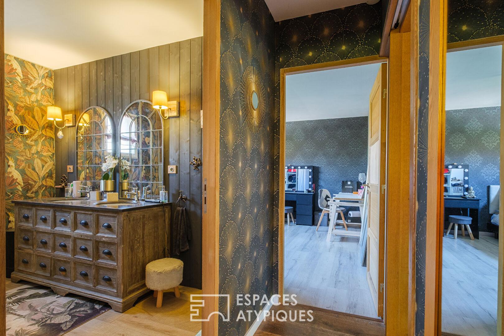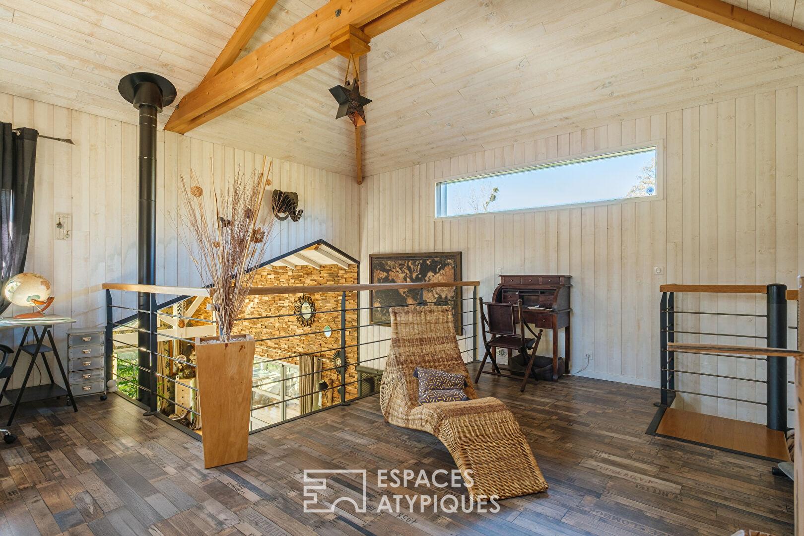 L’intérieur se distingue par une pièce de vie spectaculaire de 80 m² sous une hauteur cathédrale dépassant les 4 mètres. Baigné de lumière grâce à d’immenses baies vitrées, cet espace ouvert rassemble un salon chaleureux avec poêle à bois, une salle à manger conviviale et une cuisine équipée. L’architecture privilégie la fluidité et les volumes, menant à deux chambres spacieuses dotées de rangements sur mesure, une buanderie et une salle d’eau aux prestations soignées. Une mezzanine lumineuse surplombe le séjour, offrant un espace polyvalent idéal pour un bureau ou une bibliothèque. En complément, un studio indépendant de 20 m², niché dans un ancien bâti en pierre rénové, propose une quatrième chambre avec sa propre cuisine et salle d’eau.