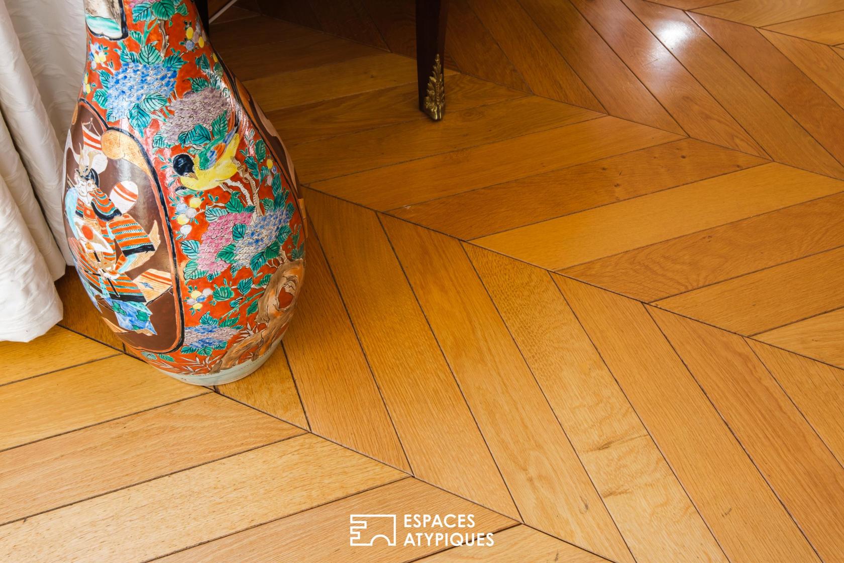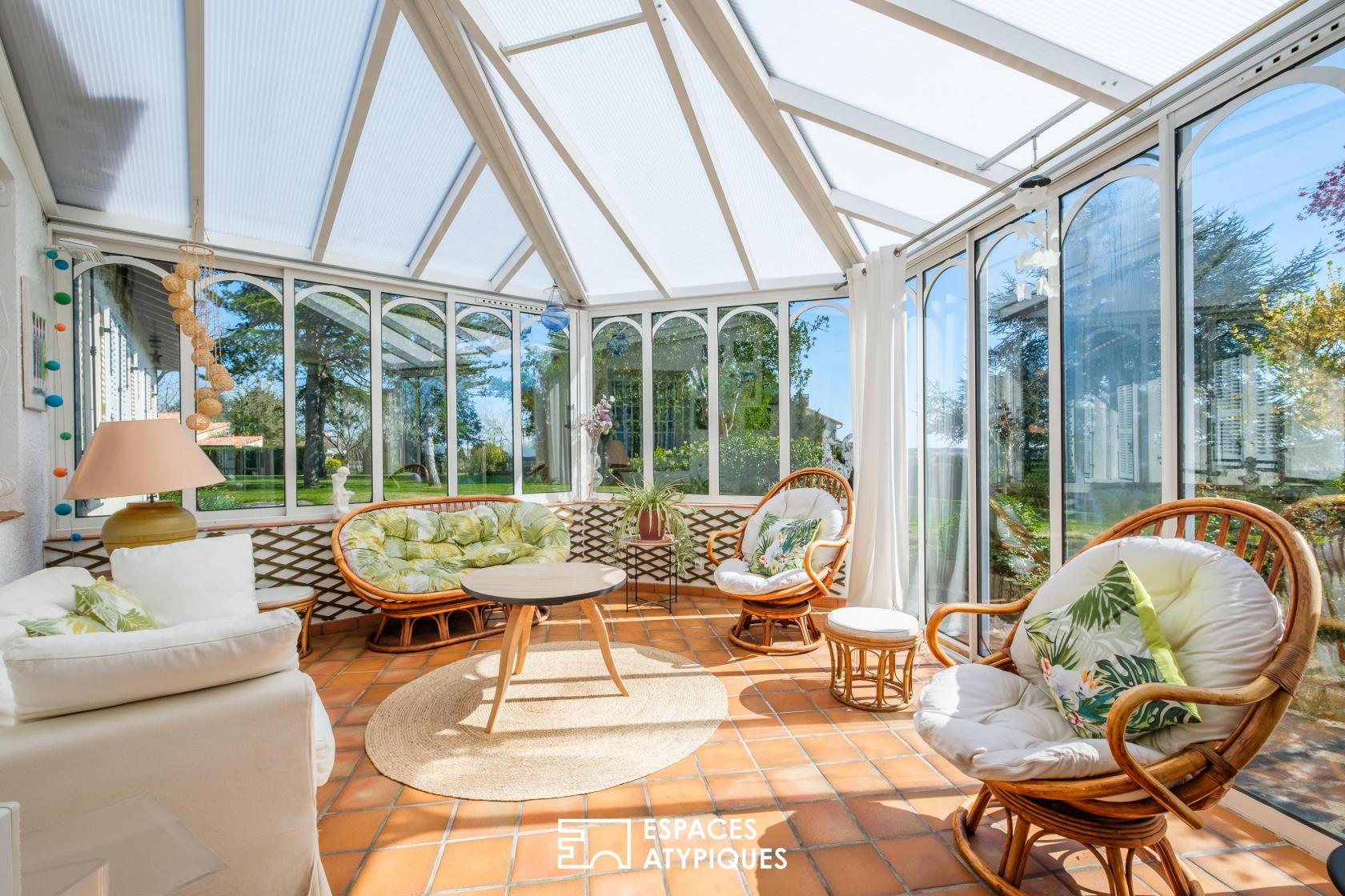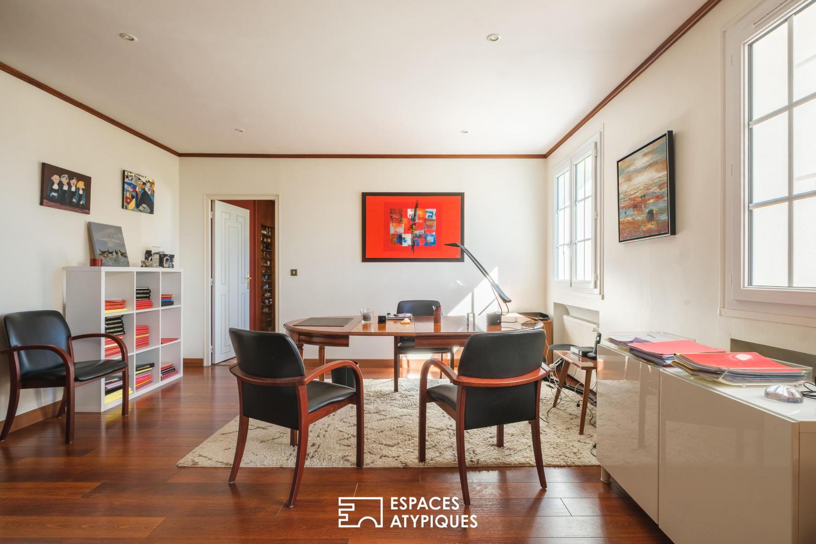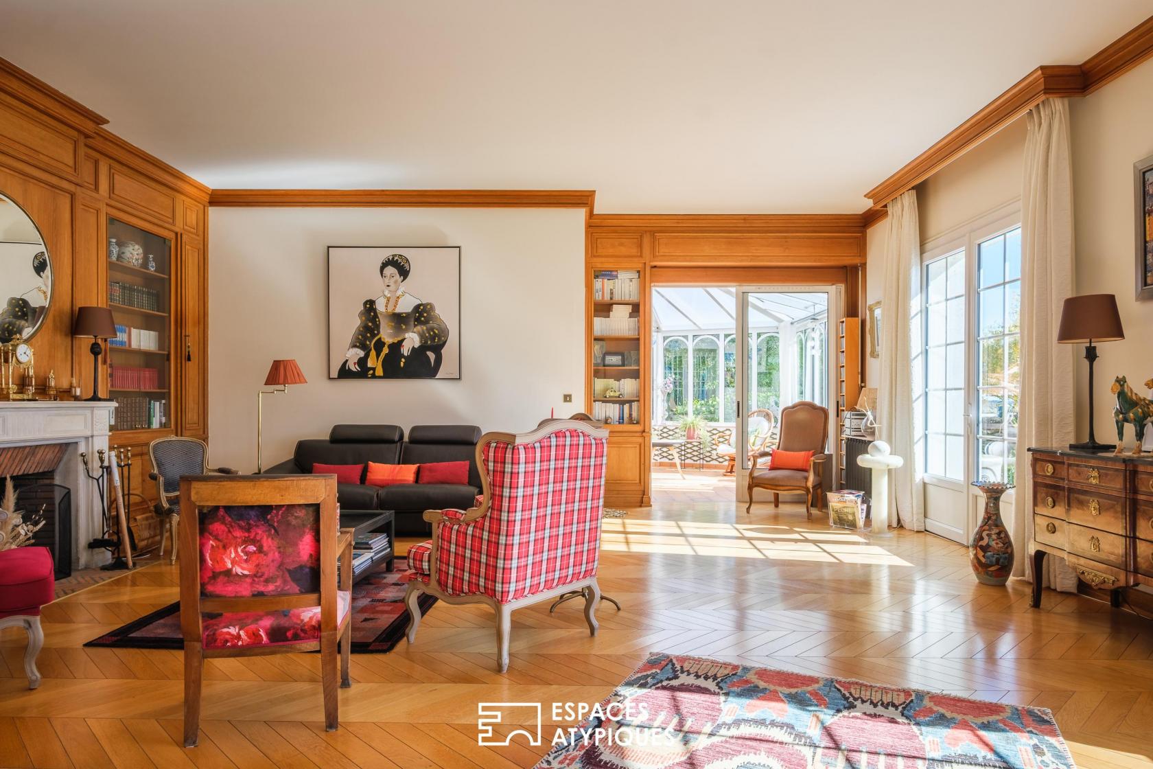 Dès l’entrée, la demeure abolit les frontières. Les volumes de réception, baignés d’une lumière omniprésente, s’articulent autour d’immenses baies vitrées qui cadrent le jardin comme autant de tableaux vivants. Ici, les matériaux nobles dialoguent avec les lignes d’époque, créant une atmosphère à la fois feutrée et résolument tournée vers la nature.