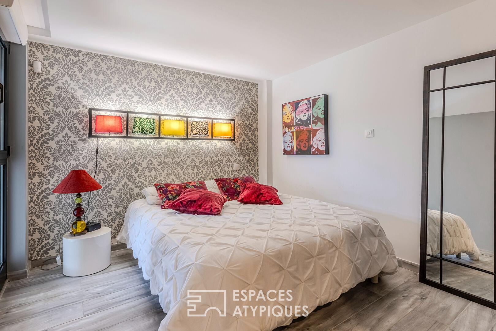 L’escalier métallique, à la fois graphique et aérien, structure les volumes et assure une continuité harmonieuse entre les niveaux. Un accès extérieur depuis cet étage vient enrichir les possibilités d’usage.