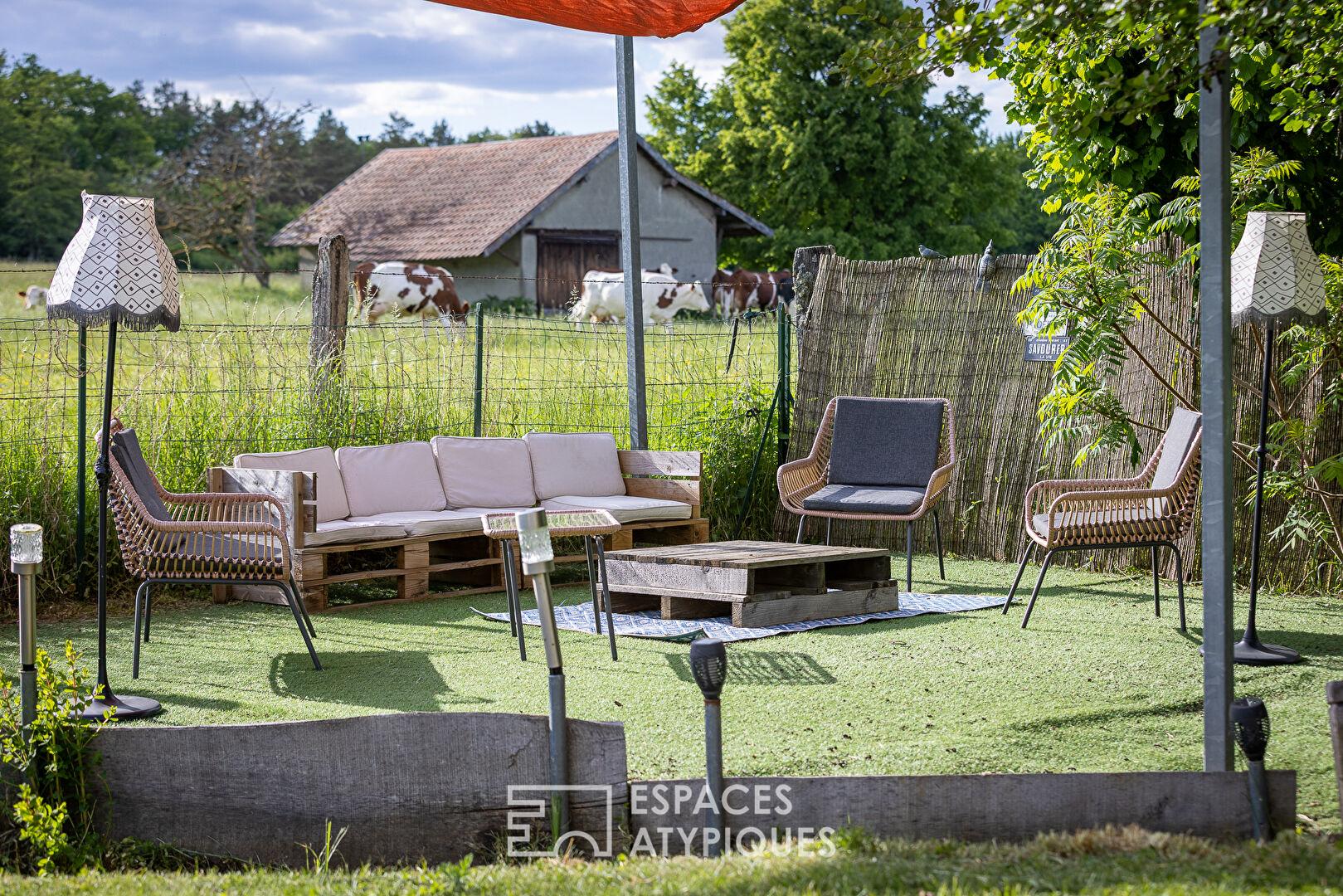 À l’extérieur, la piscine chauffée s’intègre dans un jardin pensé pour la détente, tandis que la pergola bioclimatique permet de profiter des lieux en toute saison. L’ensemble s’inscrit dans un environnement naturel apaisant, avec une vue dégagée sur la campagne, tout en restant à proximité des écoles, commerces et services.