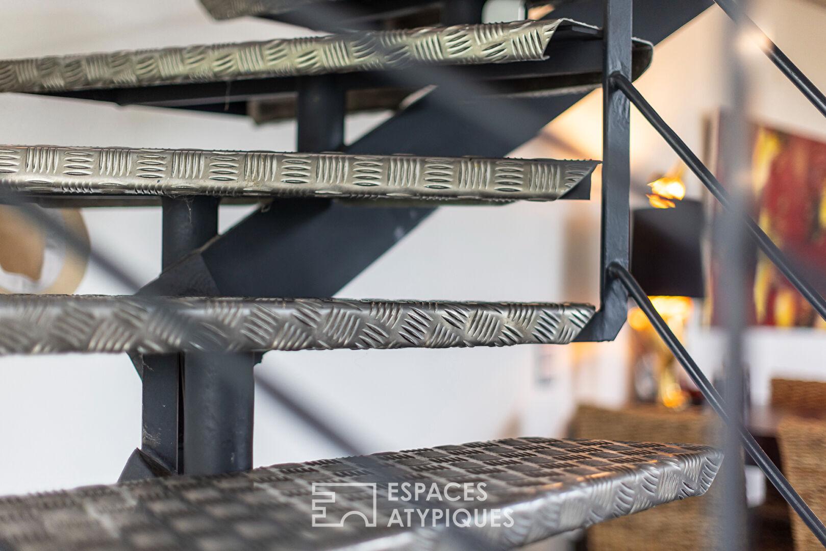 L’escalier métallique, à la fois graphique et aérien, structure les volumes et assure une continuité harmonieuse entre les niveaux. Un accès extérieur depuis cet étage vient enrichir les possibilités d’usage.