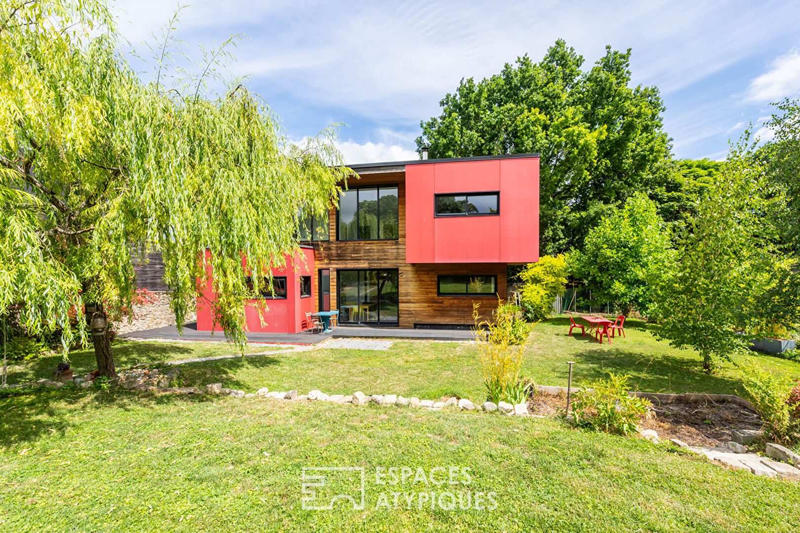 Construite en 2012, cette maison d’architecte avec une ossature en bois développe une surface de 160m2 et bénéficie d’un jardin de plus de 1000m2. Elle associe dans sa construction design contemporain et matériaux durables.