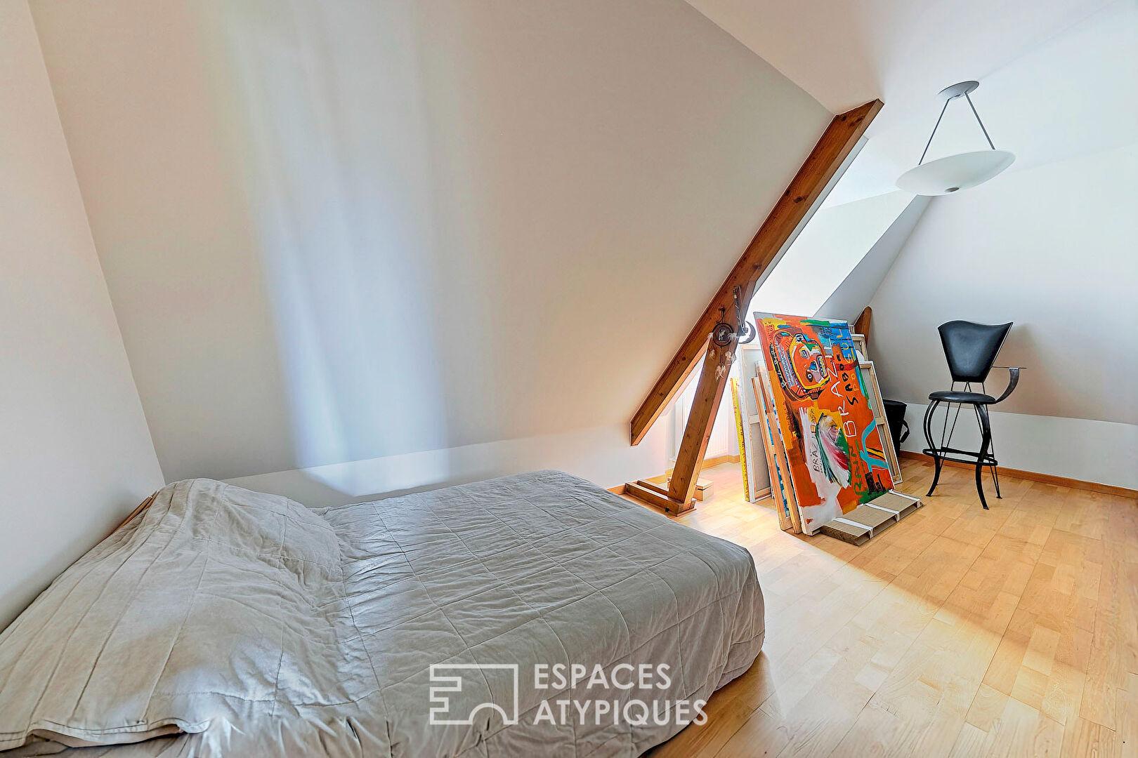 L’intérieur révèle une circulation fluide et des volumes généreux. Le rez-de-chaussée accueille une très grande pièce de vie lumineuse abritant en son centre une cheminée, véritable coeur du foyer. Une suite parentale confortable vient compléter ce niveau, garantissant ainsi une vie de plain-pied.