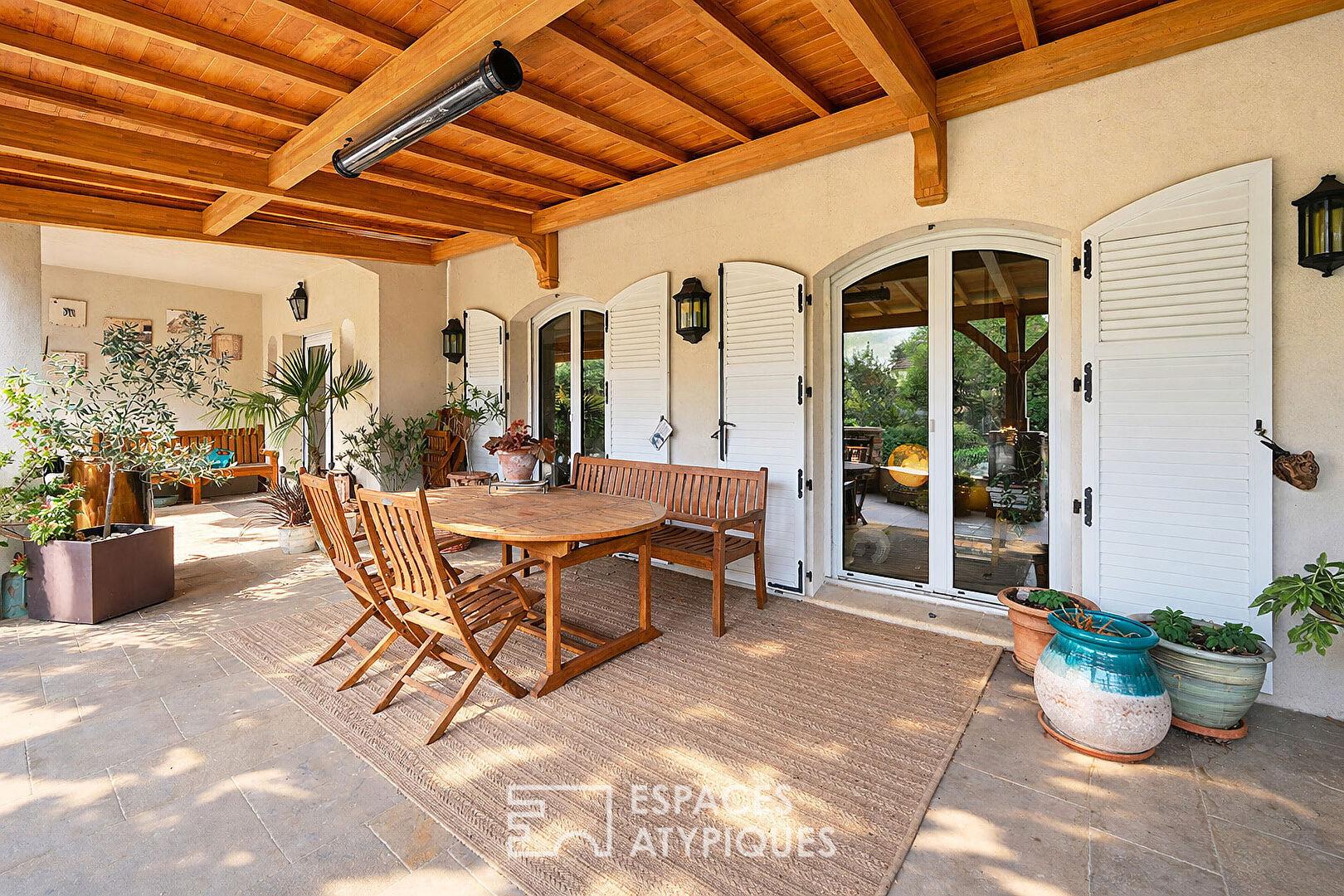 A l’extérieur, le vaste jardin clos et arboré assure une intimité totale, loin des regards. Enfin, la terrasse en pierre, abritée par une exceptionnelle pergola en bois, prolonge les espaces de réception vers un écrin de verdure aux essences variées.