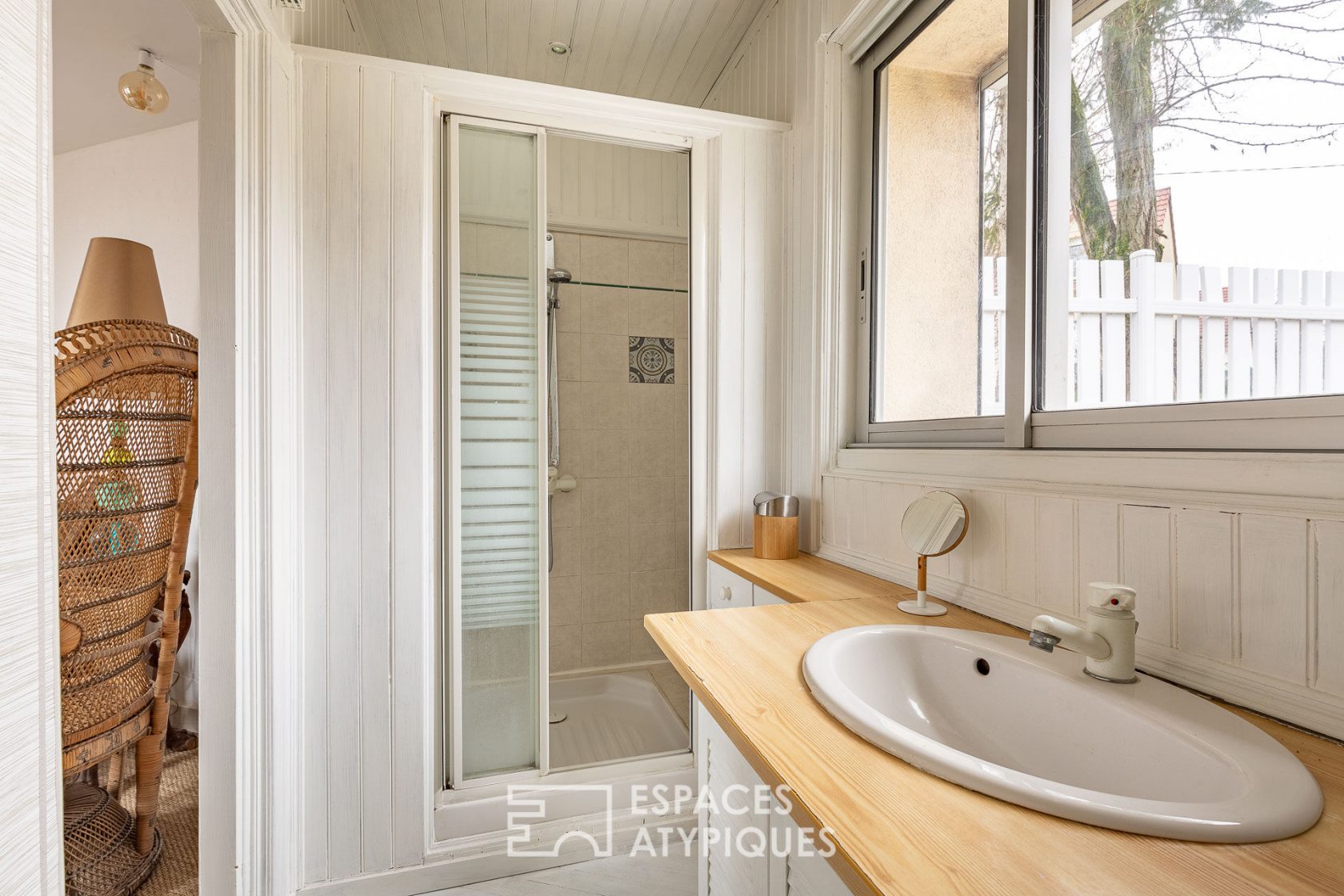 Cette maison de conception originale s’ouvre sur un vaste séjour de 70 m2 avec sa cuisine américaine offrant de nombreuses possibilités d’aménagement. De grandes baies vitrées permettent un accès direct sur une première grande terrasse avec cuisine d’été et un vaste terrain en pente. Une arrière-cuisine pouvant faire usage de buanderie, une salle de bain et des WC séparés complètent ce niveau.