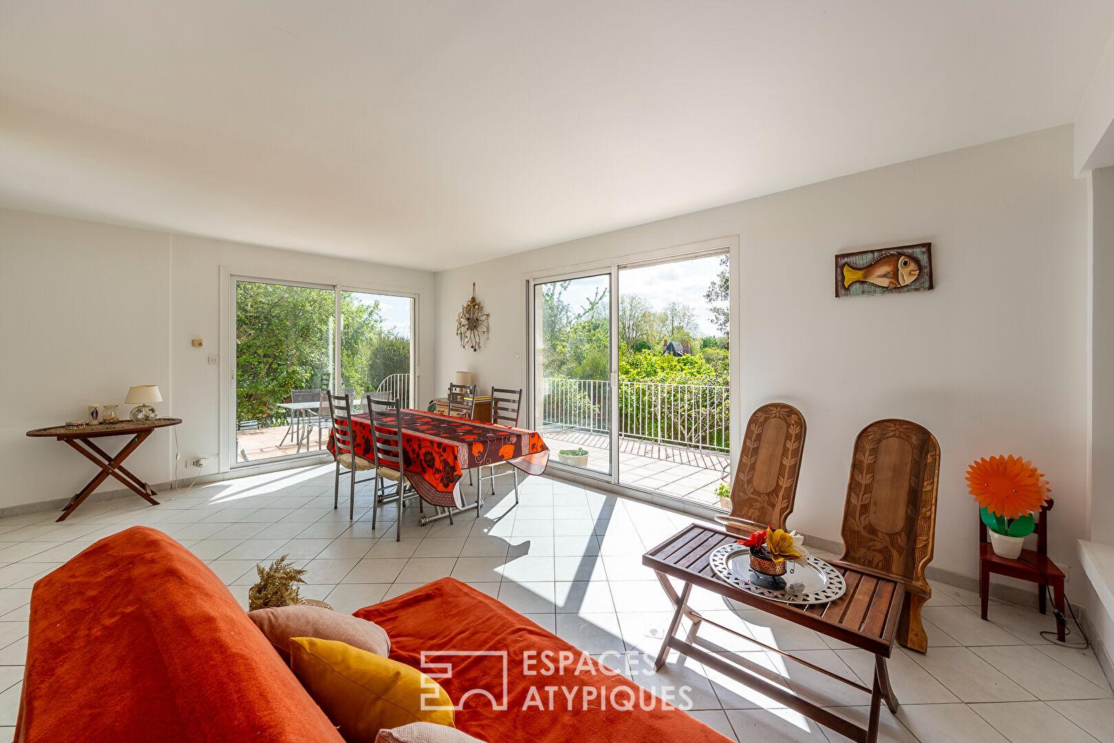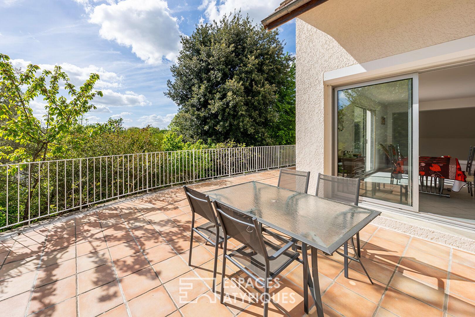 De l’autre côté, une cuisine dînatoire indépendante et aménagée ouvre sur une vaste terrasse qui surplombe le jardin. Accessible aussi bien depuis le salon que la cuisine, invitant à des déjeuners suspendus au-dessus de la verdure, cette terrasse prolonge naturellement cette surface.