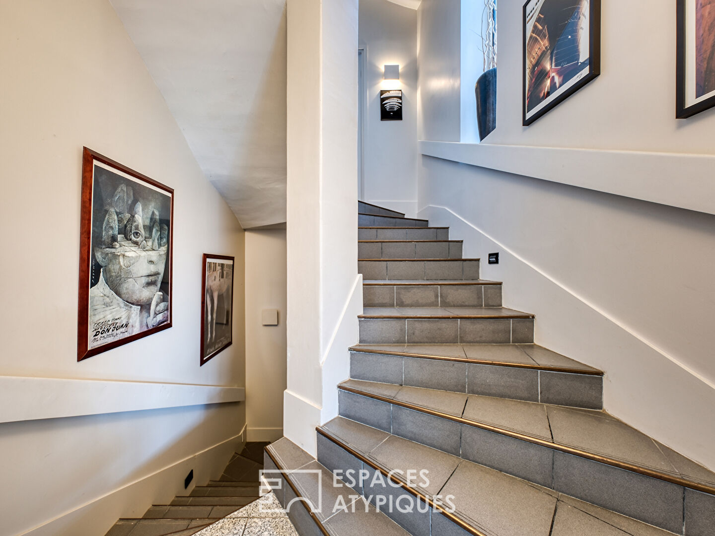 La cage d’escalier dessert directement les paliers inférieurs et supérieurs par demi-niveaux. Au demi-niveau inférieur un espace ménage. Au demi-niveau supérieur, des sanitaires.