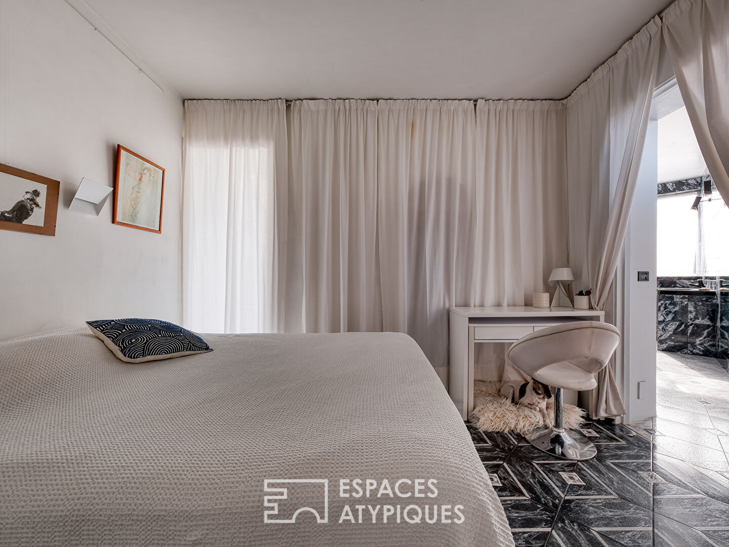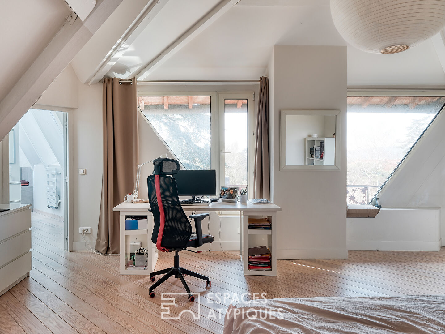 Le second et dernier étage développe, sur 87m2 de plancher, deux autres suites avec pour chacune, une partie couchage, un bureau et une pièce d’eau avec sanitaires. Une autre chambre pouvant servir de bureau indépendant ou de dressing vient agrémenter ce dernier étage.