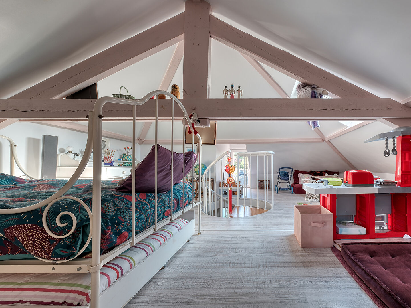 Toujours au rez-de-chaussée et situé dans un bureau, un escalier en colimaçon dessert des combles aménagés comme salle de jeux et espace nuit pour les enfants. Ils constituent un cocon douillet pouvant aussi s’adapter à d’autres usages.