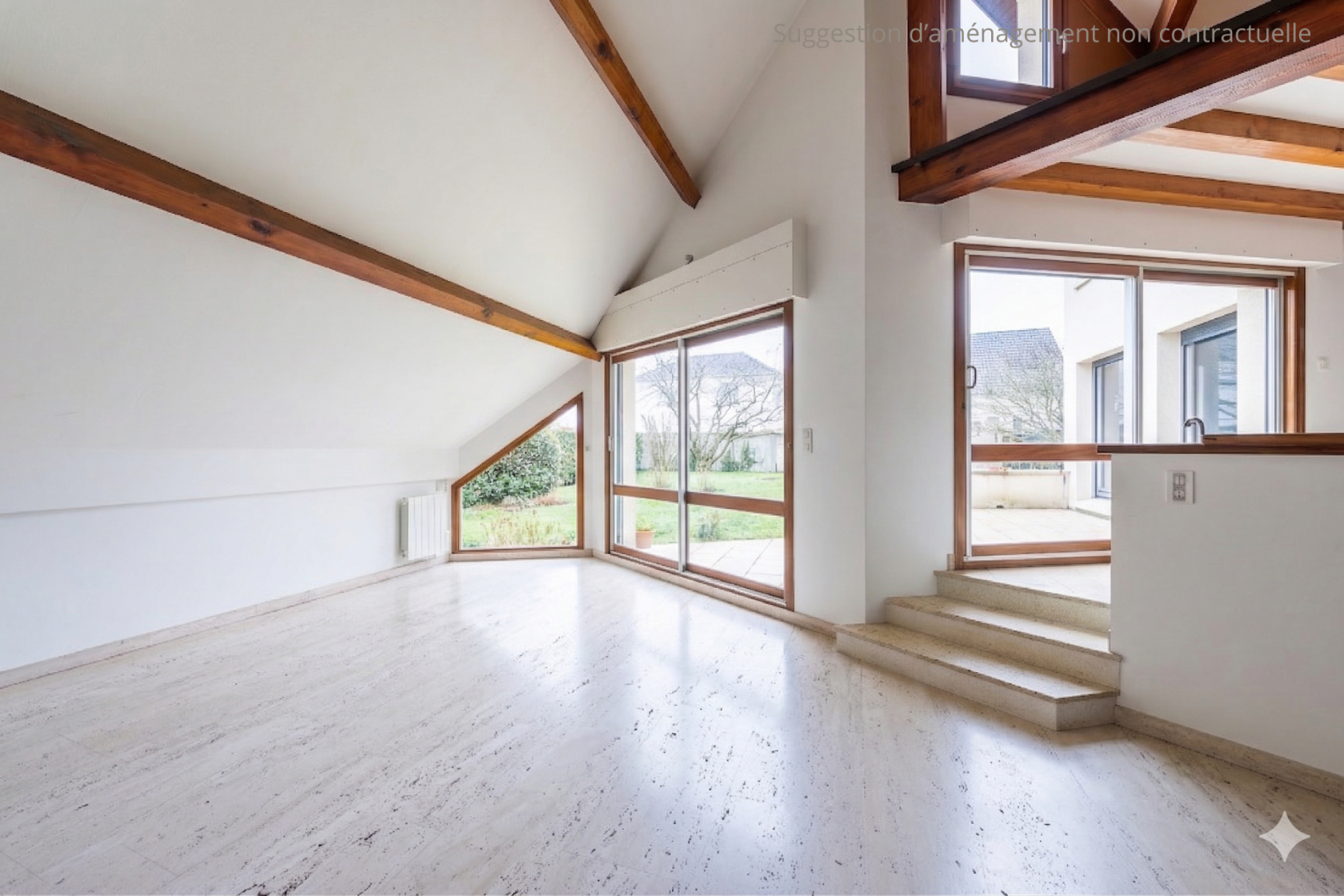 Dès l’entrée, le rez-de-chaussée révèle un salon sublimé par un sol en marbre d’Italie, une charpente apparente et une cheminée à foyer fermé. Le mobilier sur mesure souligne l’harmonie des lieux et l’accès direct à la terrasse exposée Sud-Ouest prolonge