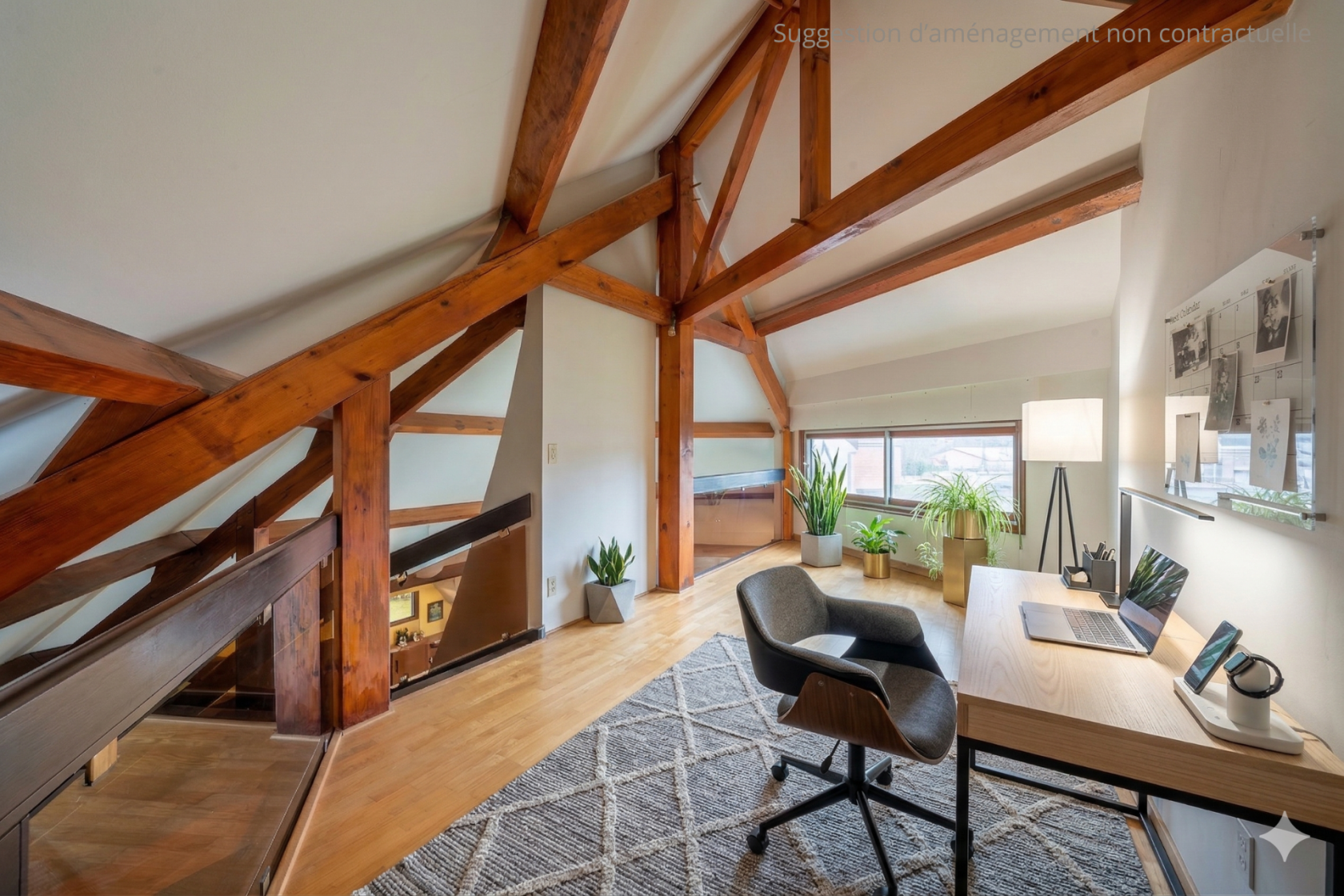L’étage accueille une mezzanine surplombant le séjour, offrant un espace lumineux pour un bureau. Deux chambres supplémentaires (dont une avec balcon) et une salle de bain, terminent l’espace nuit.