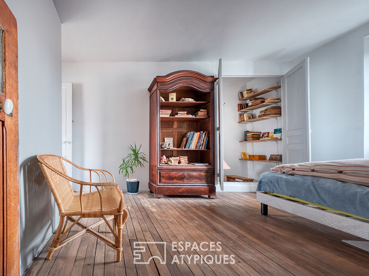 Desservi par trois escaliers distincts, ce premier étage aux volumes généreux dévoile une circulation fluide et harmonieuse. L’escalier central mène à une salle de bain avec sanitaires, deux chambres en enfilade et une mezzanine bibliothèque, dont l’élégant escalier en bois descend au grand salon. Sur l’aile droite, un palier dessert une grande chambre, une troisième salle de bain avec sanitaires et une cinquième chambre attenante, toutes baignées de lumière et ouvertes sur la cour et le jardin. Un escalier discret permet un retour direct à la cuisine.