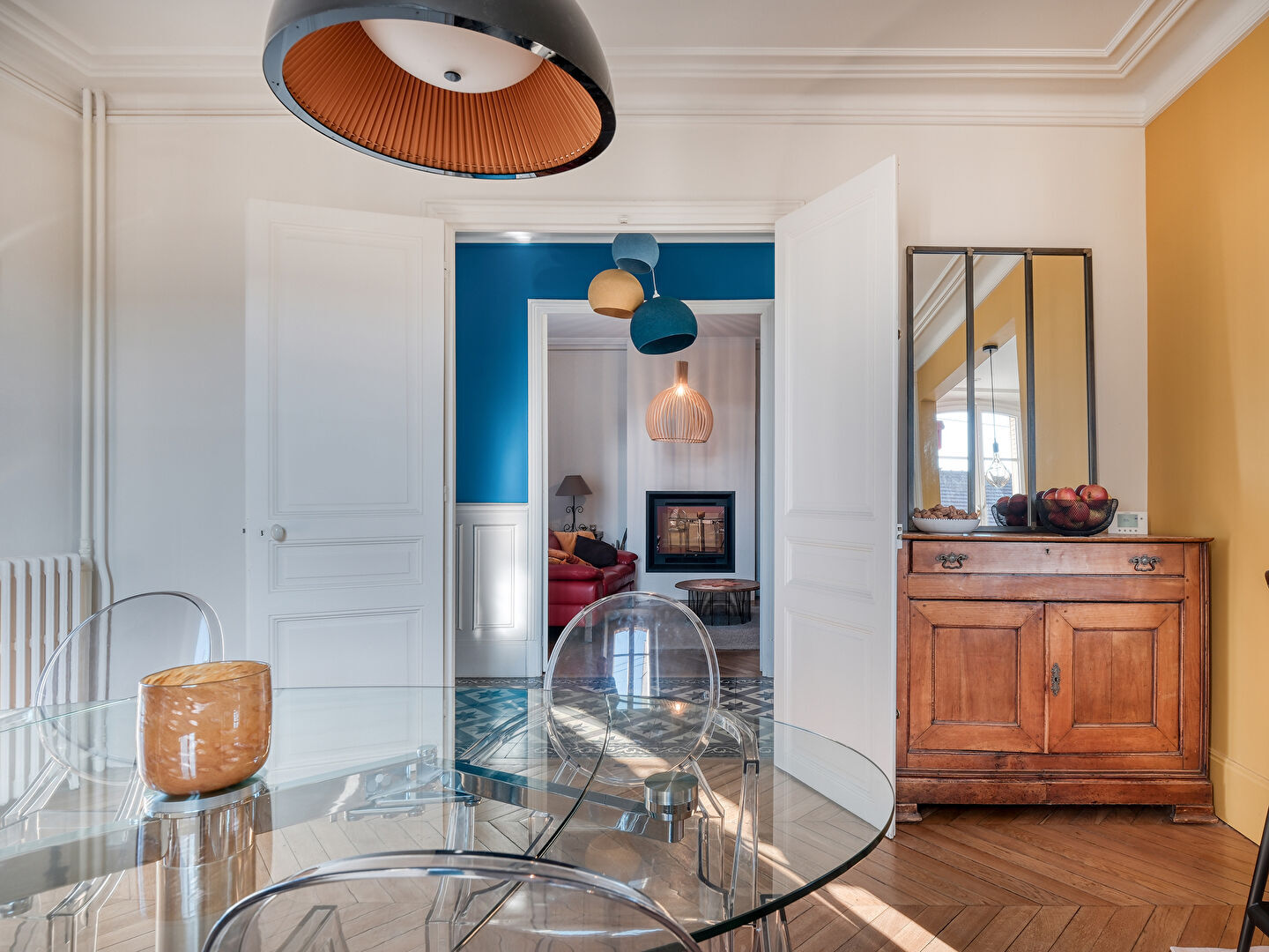 Dès l’entrée de la maison, les carreaux de ciment, le parquet ancien, les moulures et la hauteur sous plafond marquent l’authenticité du lieu. Un long couloir mène d’un côté vers un salon chaleureux agrémenté d’une cheminée, élément central, créant une ambiance conviviale.