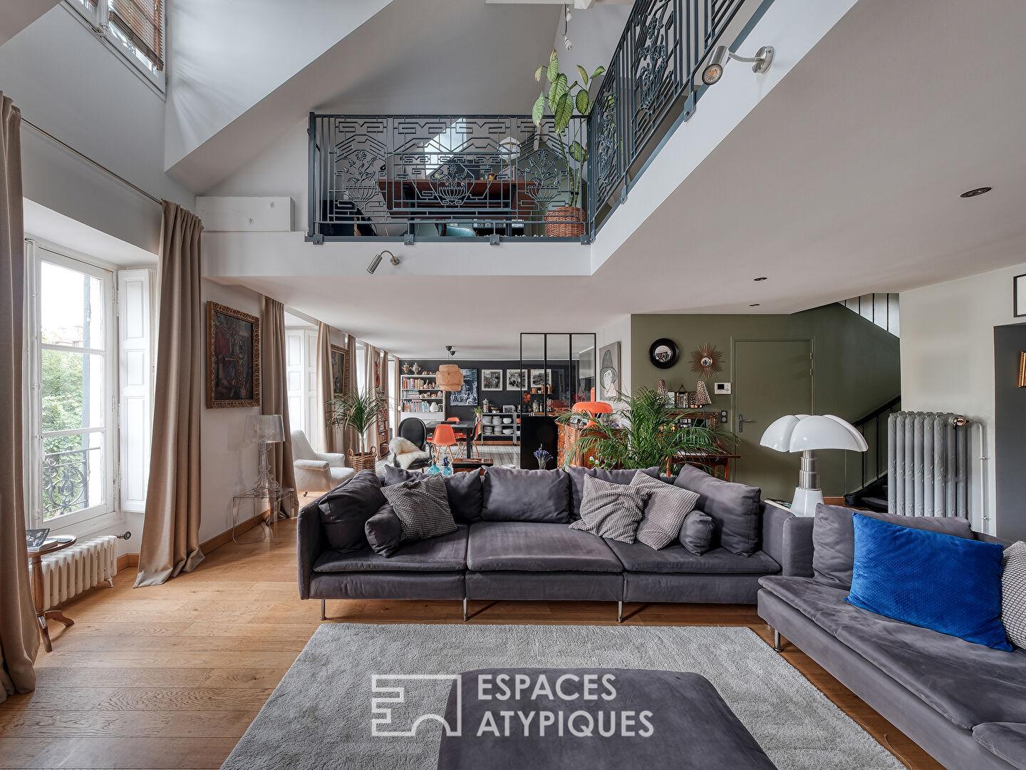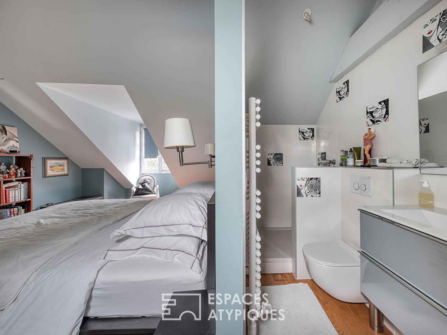 Le dernier étage accueille un espace mezzanine surplombant le séjour, offrant une perspective aérienne sur la pièce de vie. Les rambardes, réalisées sur mesure par un ferronnier, soulignent avec caractère l’architecture du lieu. Une chambre avec salle d’eau ainsi qu’une grande pièce traversante, aujourd’hui aménagée en salle de jeux, offrent de multiples possibilités d’aménagement selon les besoins et les envies.