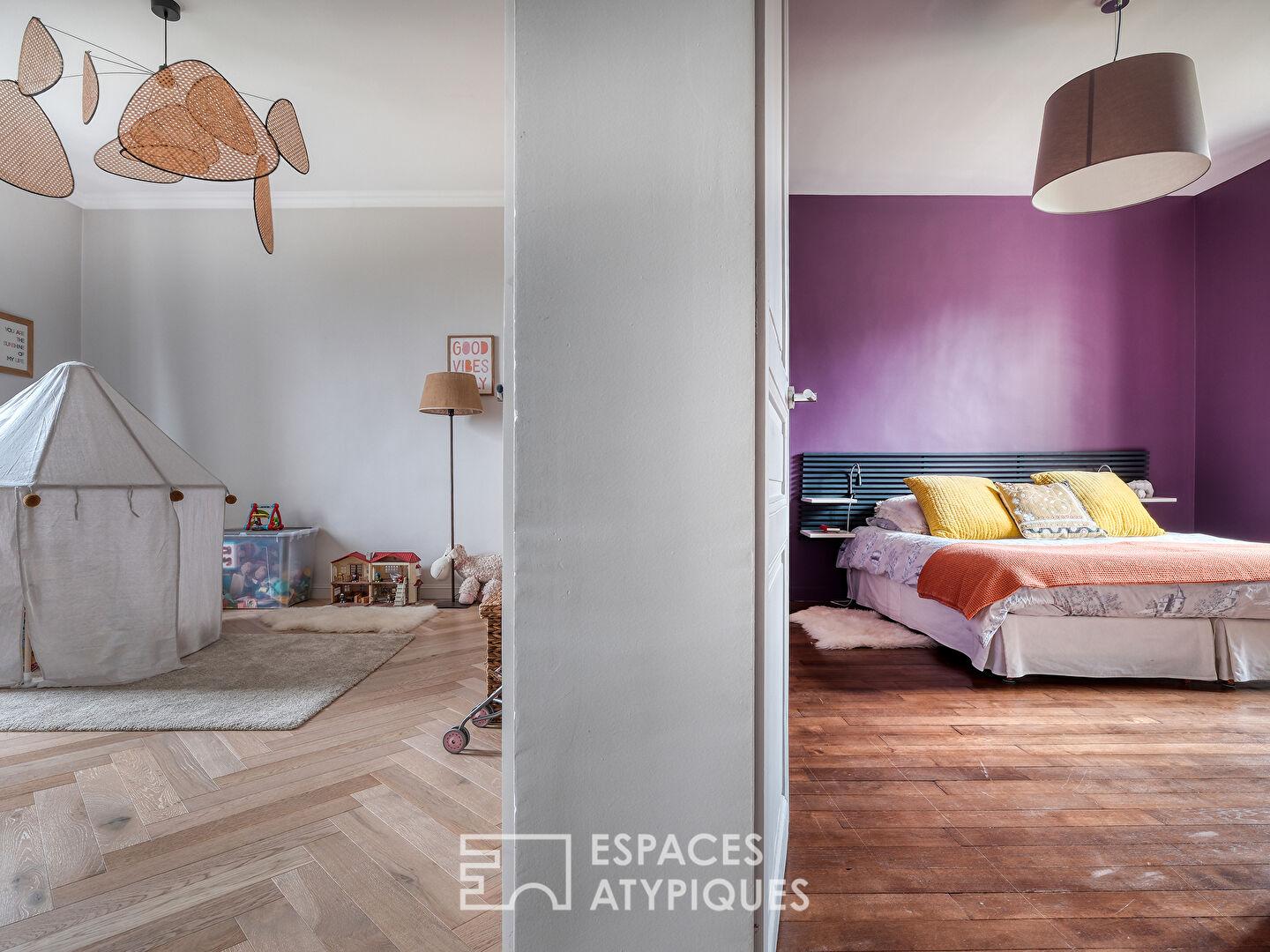 L’étage se déploie autour d’un palier central, desservant deux chambres lumineuses reliées par une pièce palière polyvalente et une salle d’eau. À l’opposé, une vaste chambre avec salle de bain attenante offre un espace cosy et indépendant, parfait pour un adolescent ou pour des invités.