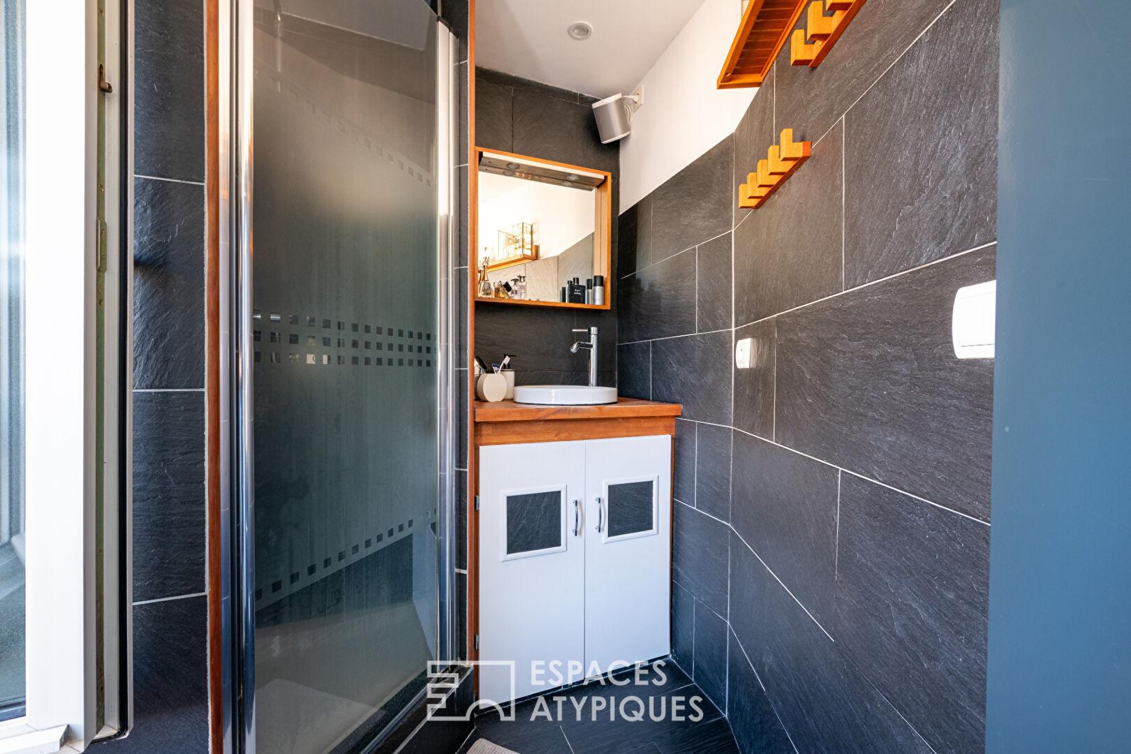 L’intérieur propose un savant équilibre entre le charme de l’ancien et une rénovation contemporaine soignée. Le rez-de-chaussée accueille une belle pièce de vie traversante de 45 m², composée d’un espace salon avec cheminée insert, ouvert sur le jardin, et d’un coin repas convivial. Dans son prolongement, la cuisine dînatoire, entièrement aménagée et équipée, offre un second espace de réception.