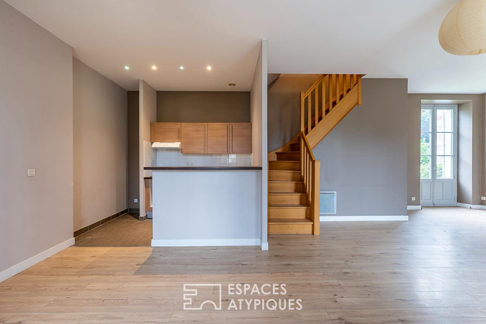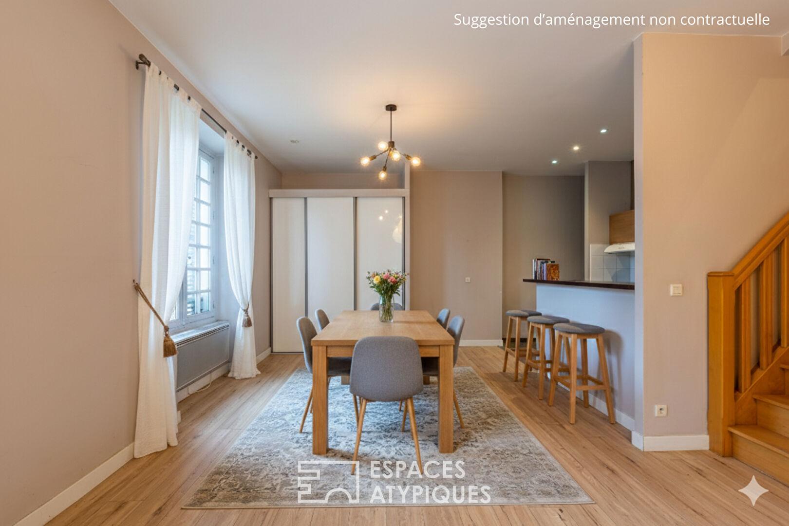 Dès l’entrée, le rez-de-chaussée s’ouvre sur un séjour lumineux avec un espace salon et un espace salle à manger avec une cuisine ouverte. Le salon donne accès à un jardin privatif de 100 m2 véritable prolongement de la pièce à vivre.