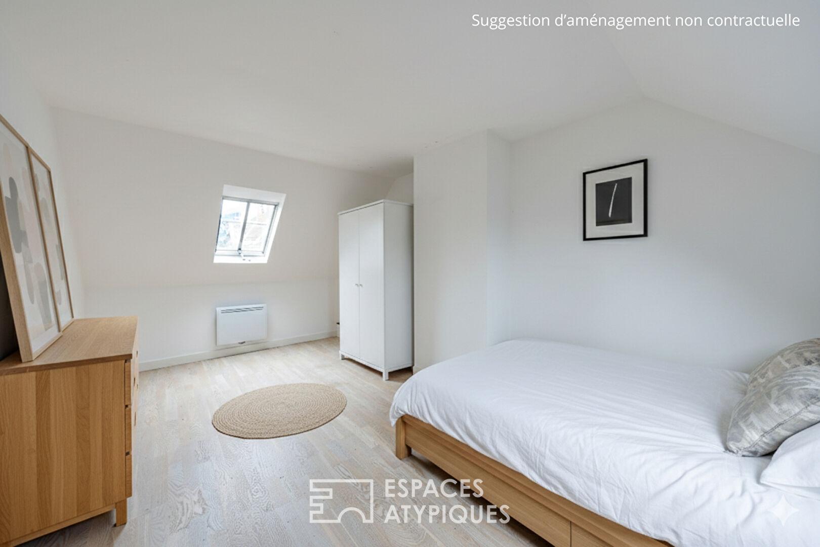 À l’étage, l’espace nuit se compose de deux chambres, d’une salle de bain et d’un sanitaire.