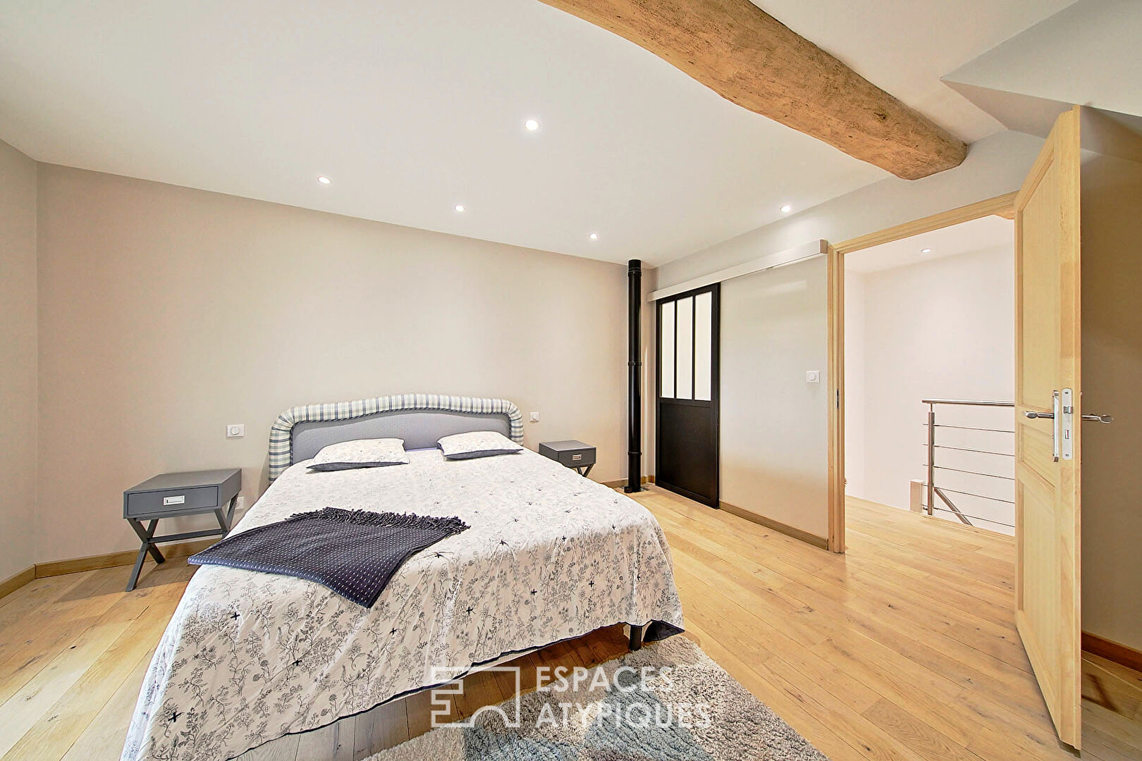 Accessible par l’intérieur de la maison mais aussi par un charmant escalier extérieur en pierres, une pièce palière, suffisamment spacieuse, peut servir de bureau. Ce niveau est complété par une salle de bain avec douche à l’italienne et des WC.