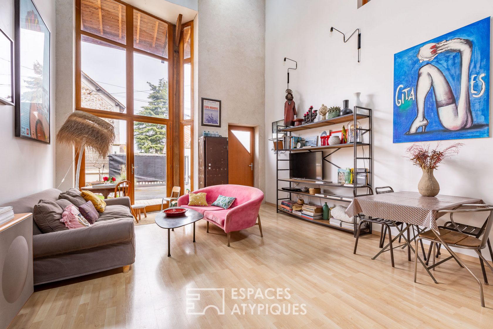 Réhabilitée de manière contemporaine, elle offre au rez-de-chaussée, une grande pièce à vivre d’une hauteur de plafond de plus de 7 mètres et une grande cuisine ouverte aménagée. Une chambre avec salle d’eau privative et un bureau (ou chambre) donnent de part et d’autre de cette pièce et bénéficient d’un accès direct et indépendant dans le jardin de plus de 300m2.