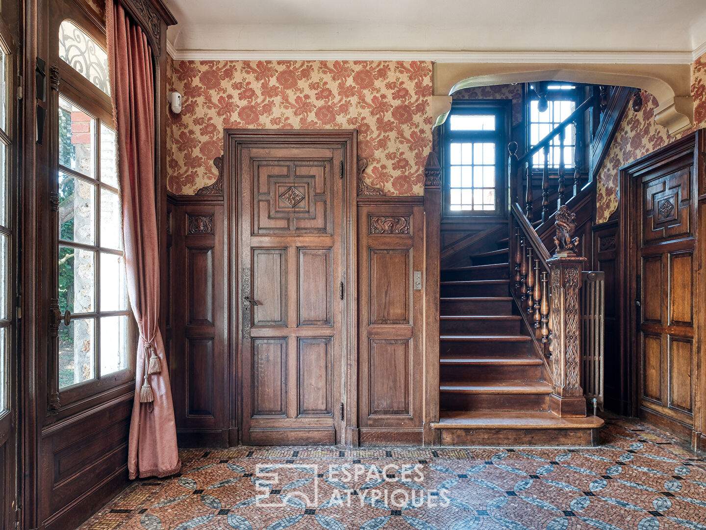 Au rez-de-chaussée, une majestueuse entrée reprend les codes des anciennes demeures anglaises, volonté de l’architecte de l’époque : boiseries, moulures, parquets anciens et carreaux de ciment.