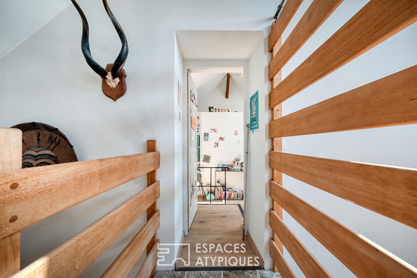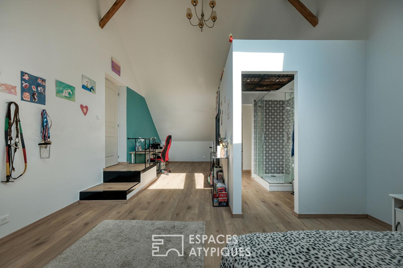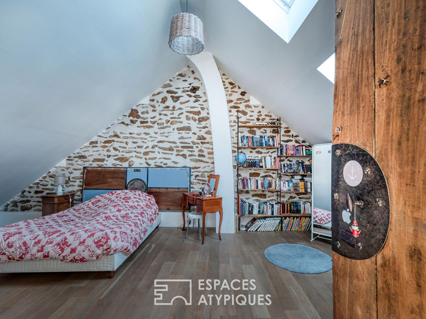 Les volumes sous combles, les ouvertures en toiture et le jeu de matières renforcent l’identité atypique du bien.