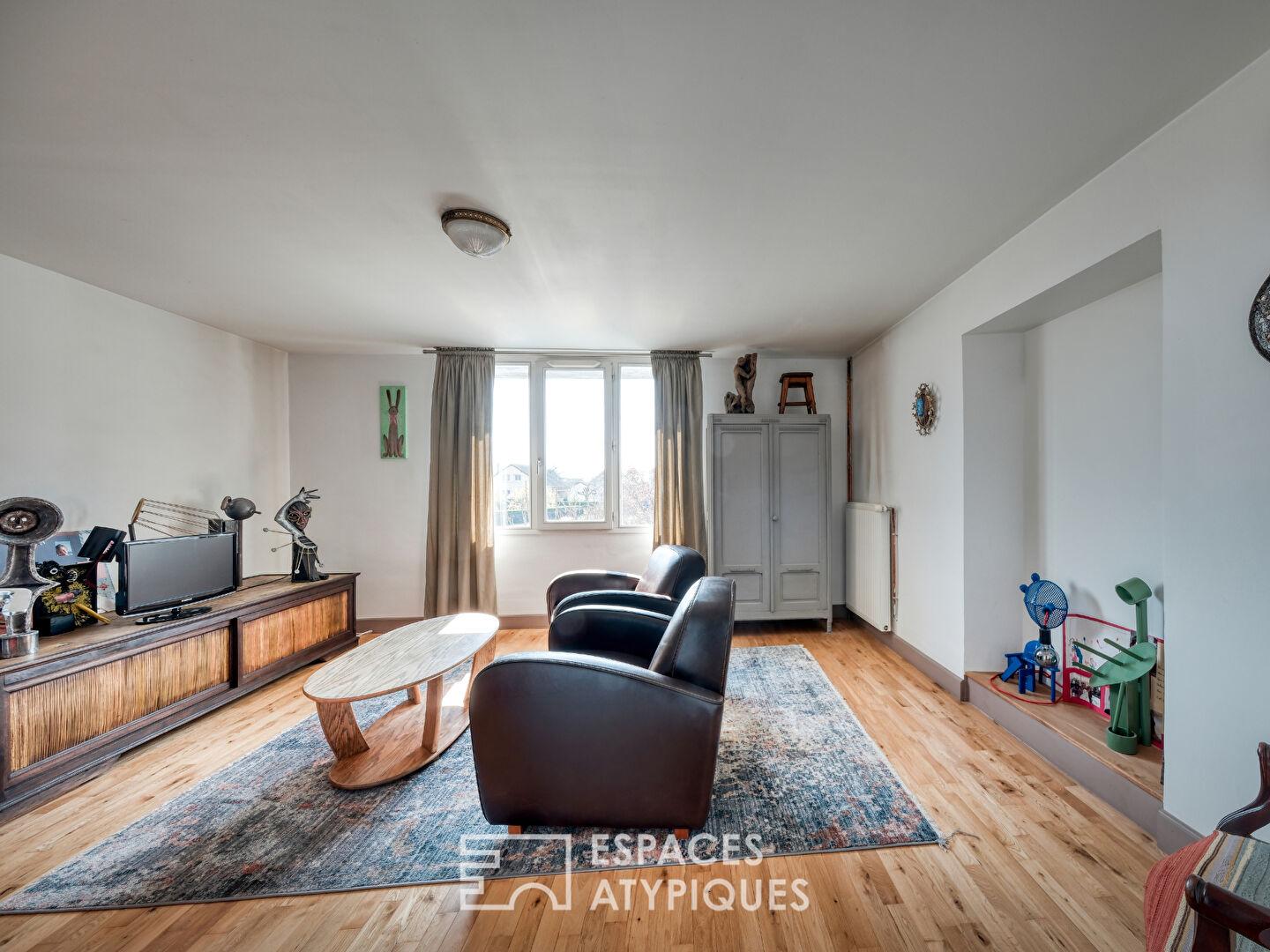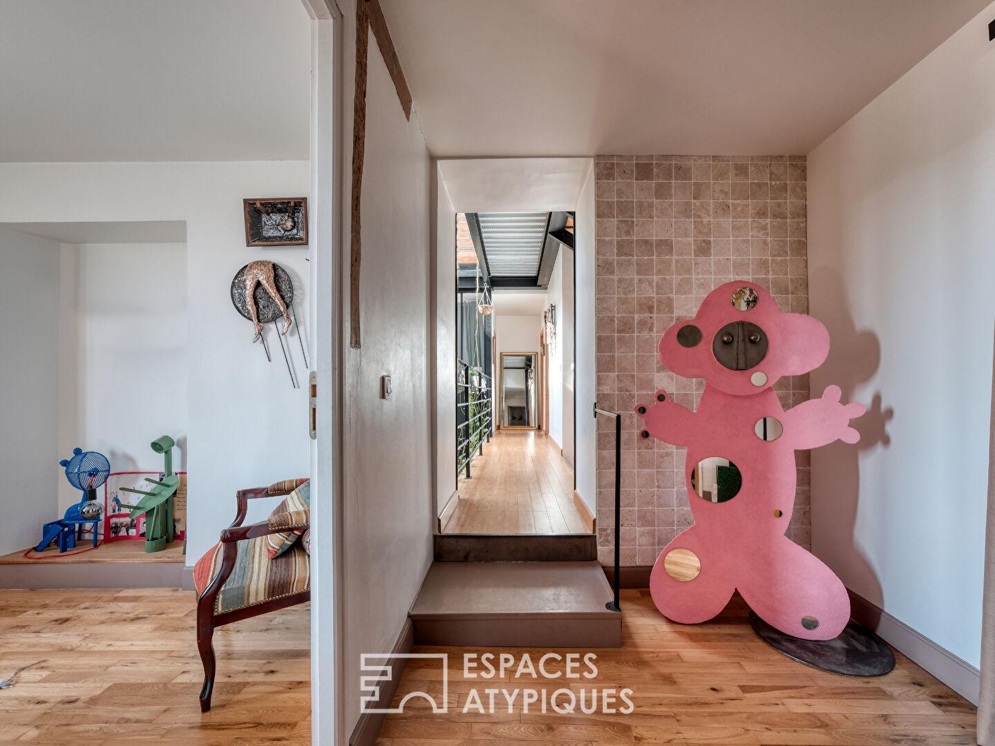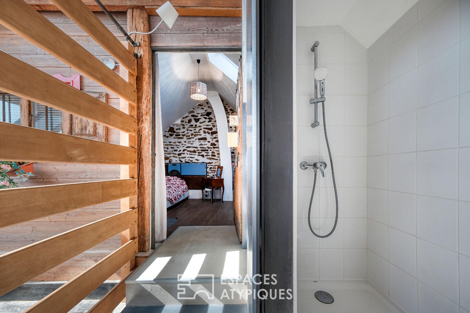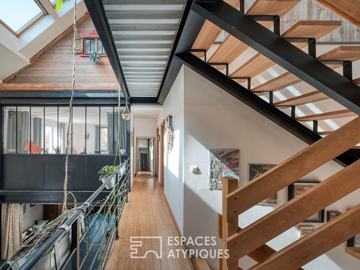 Les volumes sous combles, les ouvertures en toiture et le jeu de matières renforcent l’identité atypique du bien.