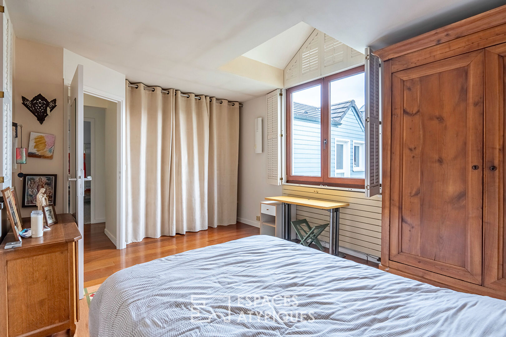 Nichée au calme absolu, au fond d’une impasse et à proximité des transports (M12, T2 et RER C), cette propriété a su évoluer au fil du temps pour offrir aujourd’hui un ensemble harmonieux de deux maisons totalisant 170 m² habitables, reliées par un espace extérieur avec une belle terrasse et une petite piscine.
