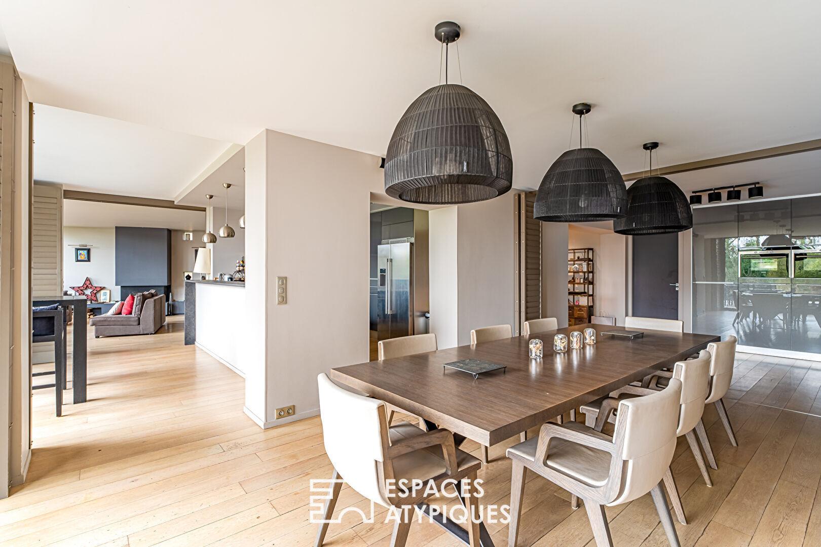 Dès l’entrée, le ton est donné avec une vue plongeante sur une réception aux volumes généreux, lumière omniprésente et agencement optimisé. Le salon cathédrale, baigné de lumière grâce à des baies vitrées toute hauteur, s’ouvre sur une immense terrasse dominant un vaste jardin terrassé, rarissime dans ce secteur. La cheminée et les jeux de cloisons mobiles permettent de moduler l’espace selon vos envies, pour des moments chaleureux en famille ou de grandes réceptions entre amis.