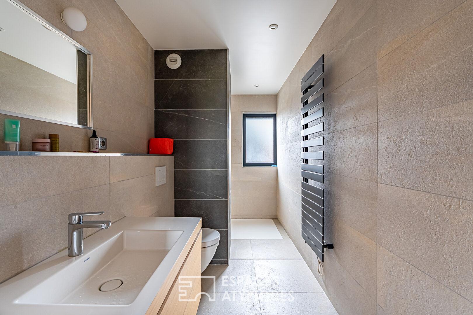 Le niveau supérieur se distingue par sa modularité. Il accueille actuellement deux grandes chambres, une salle de bains, une salle de douche avec coin buanderie et deux sanitaires. L’ensemble peut aisément être repensé en 3 chambres.
