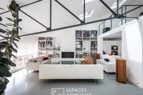 Situé à la lisière de Montrouge, dans une ancienne usine, un superbe loft à usage mixte (habitation et activité) sur trois niveaux offrant 311 m2 (302 m2 Carrez).