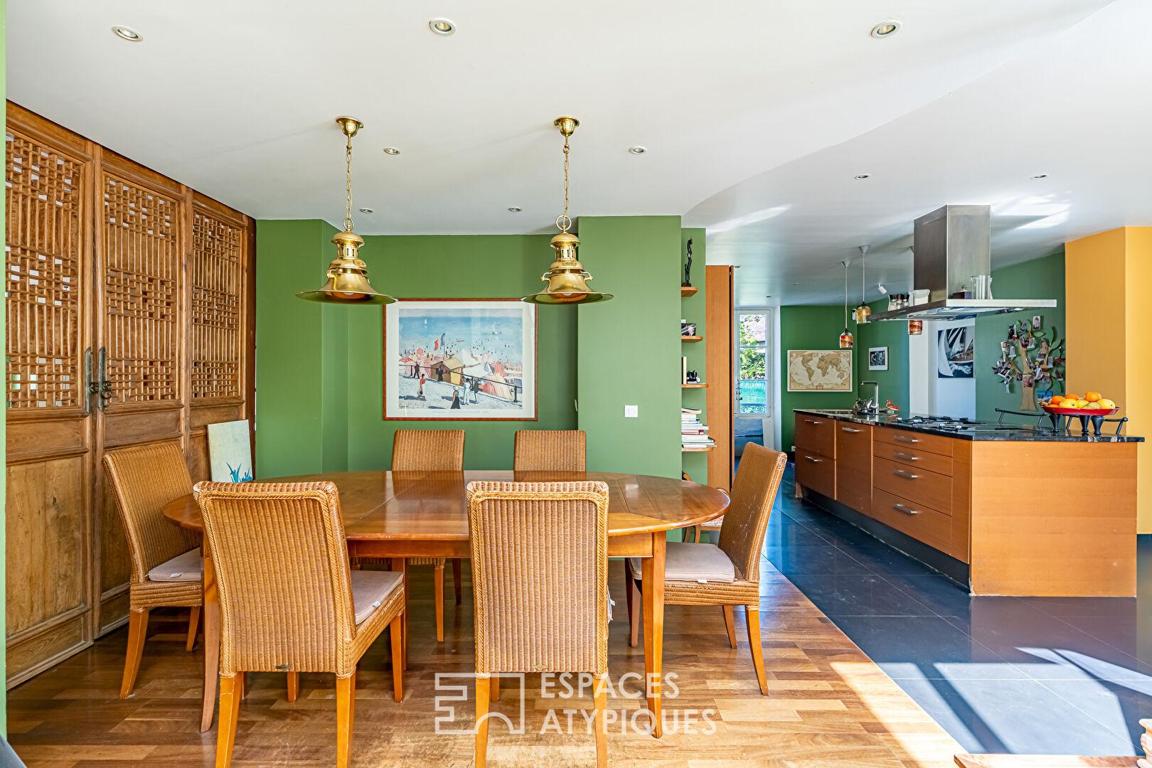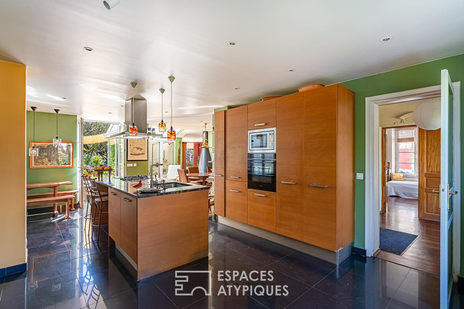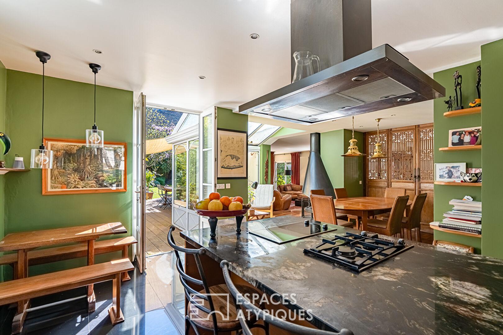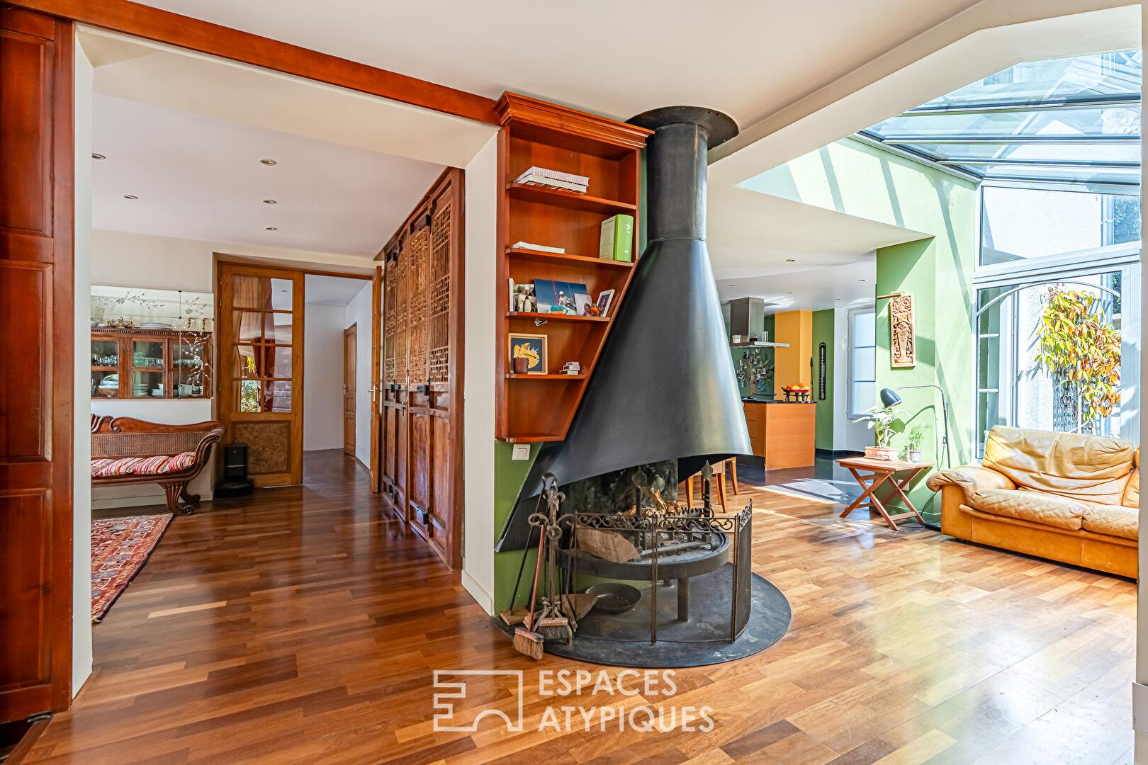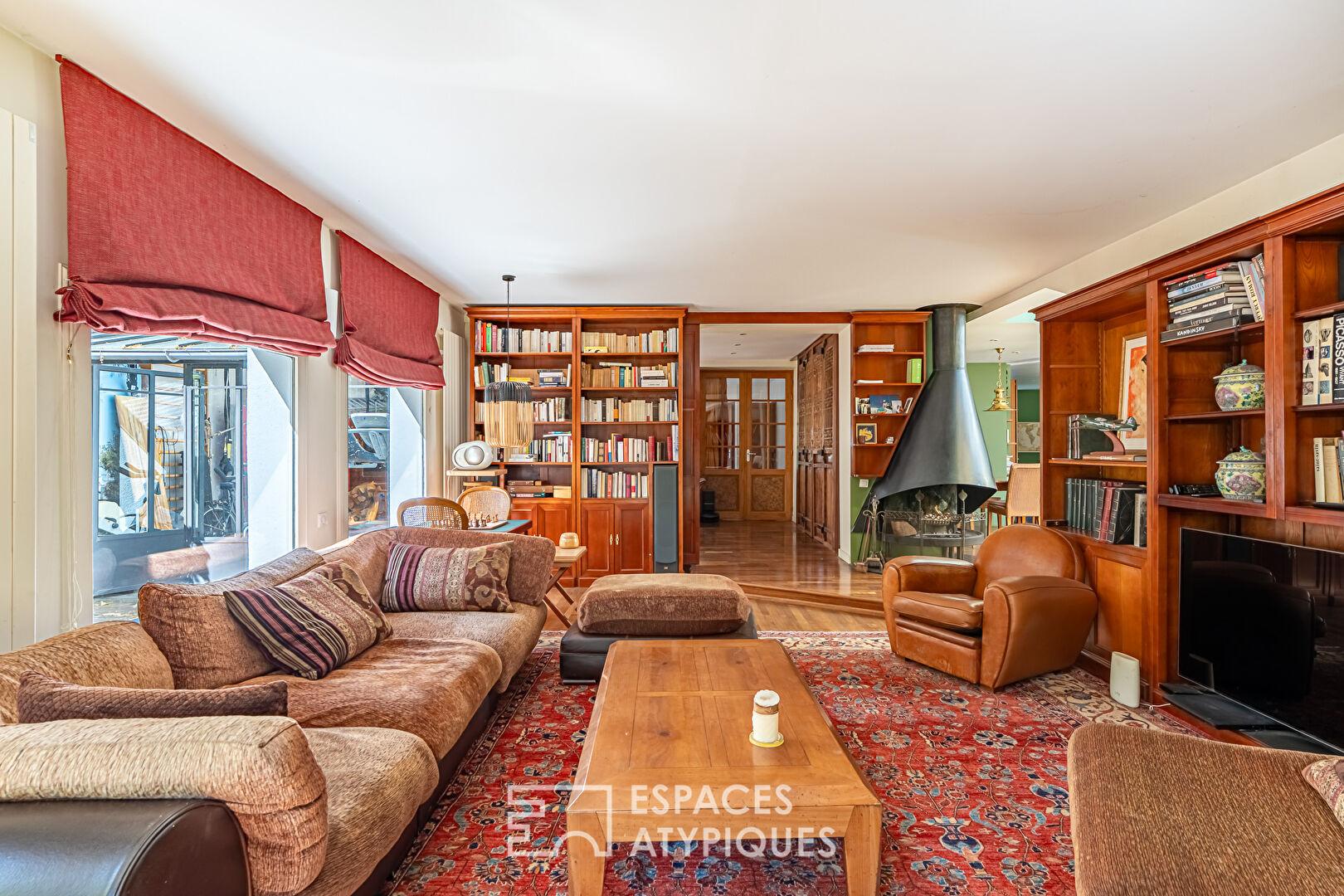Dès l’entrée, l’escalier d’époque, aux lignes élégantes, structure les circulations et donne le ton. Le rez-de-chaussée accueille plus de 90 m² de pièces de vie, pensées dans une continuité fluide et en lien constant avec le jardin. La cuisine s’organise autour d’un îlot central et s’ouvre naturellement vers la terrasse et le jardin exposés plein sud, invitant à une utilisation dedans-dehors aux beaux jours. Dans son enchaînement, la salle à manger prend place dans une atmosphère chaleureuse et conviviale. Une petite véranda, accueillant la cheminée, s’intercale entre la salle à manger et le salon et crée une transition douce entre les espaces. En retrait, le salon développe une ambiance plus feutrée, tout en conservant une belle ouverture sur le jardin grâce à de larges baies. Les bibliothèques intégrées structurent les volumes et renforcent le caractère de l’ensemble. Une seconde véranda, aujourd’hui aménagée en espace de sport, offre un volume supplémentaire facilement réinterprétable selon les besoins. Un bureau, pouvant également faire office de chambre, complète ce niveau.