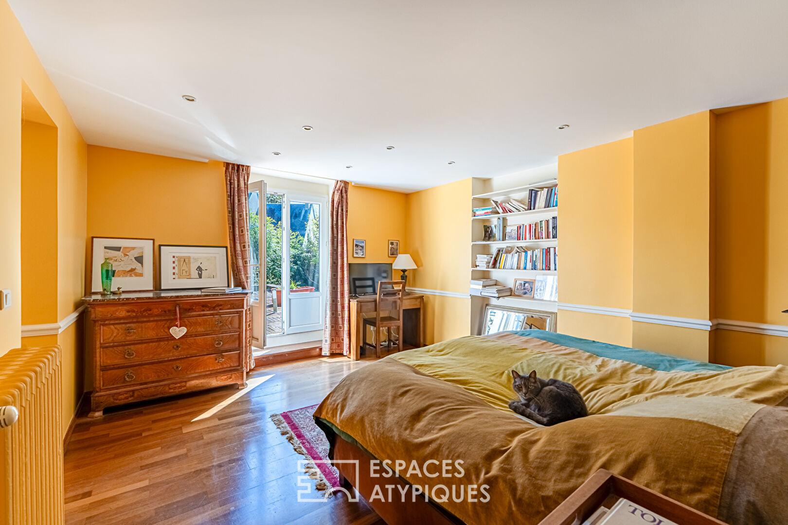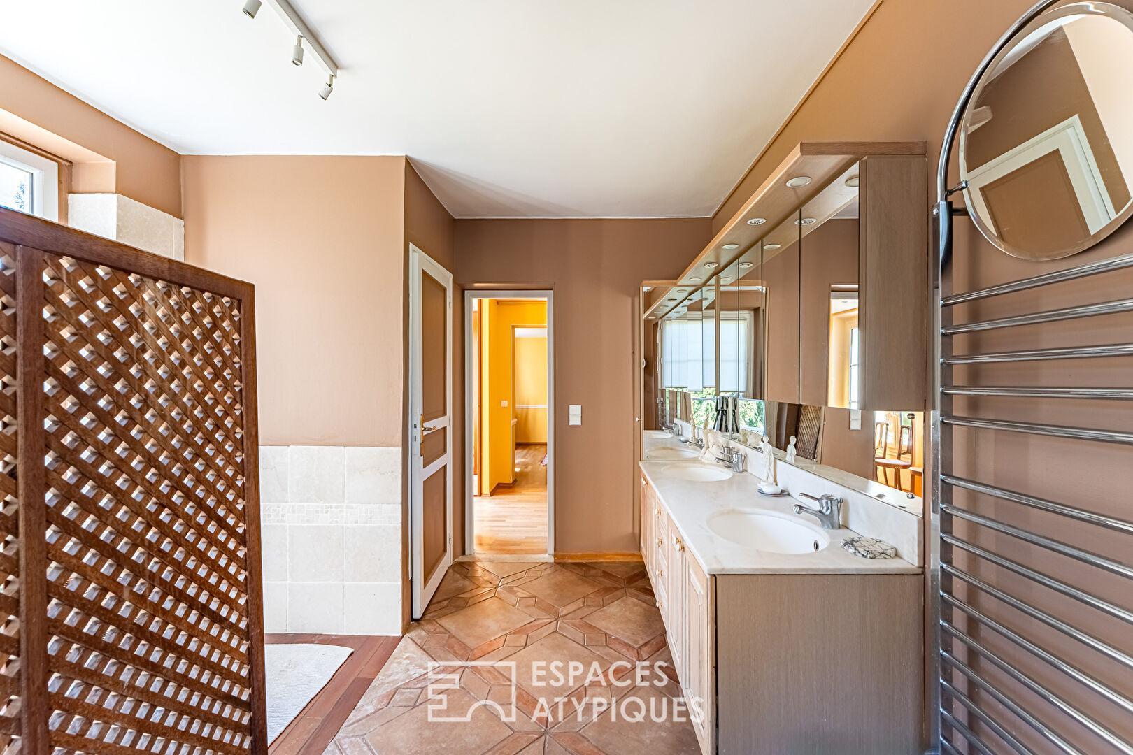 À l’étage, desservi par un vaste palier, la chambre parentale de 17 m² s’ouvre sur une large terrasse dominant le jardin. Elle est complétée par un dressing et une spacieuse salle d’eau avec double vasque. Deux pièces supplémentaires de 15 et 11 m² (chambres ou bureaux) viennent compléter ce niveau.