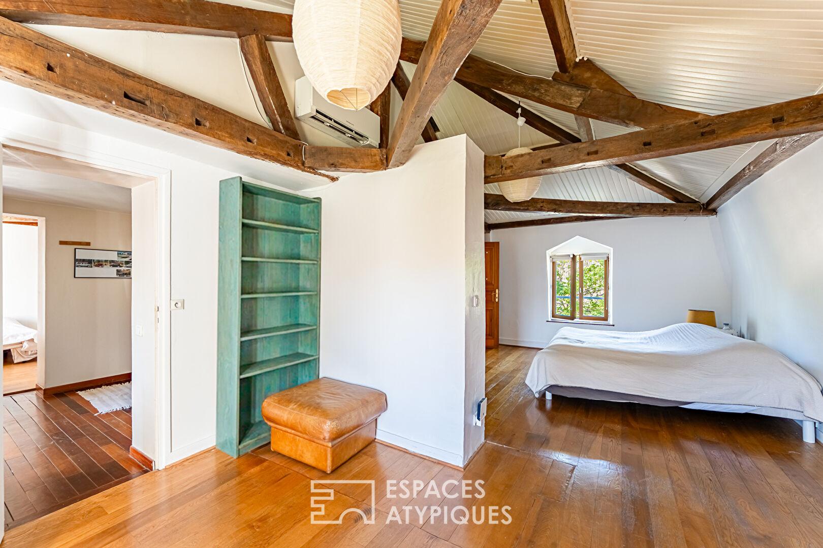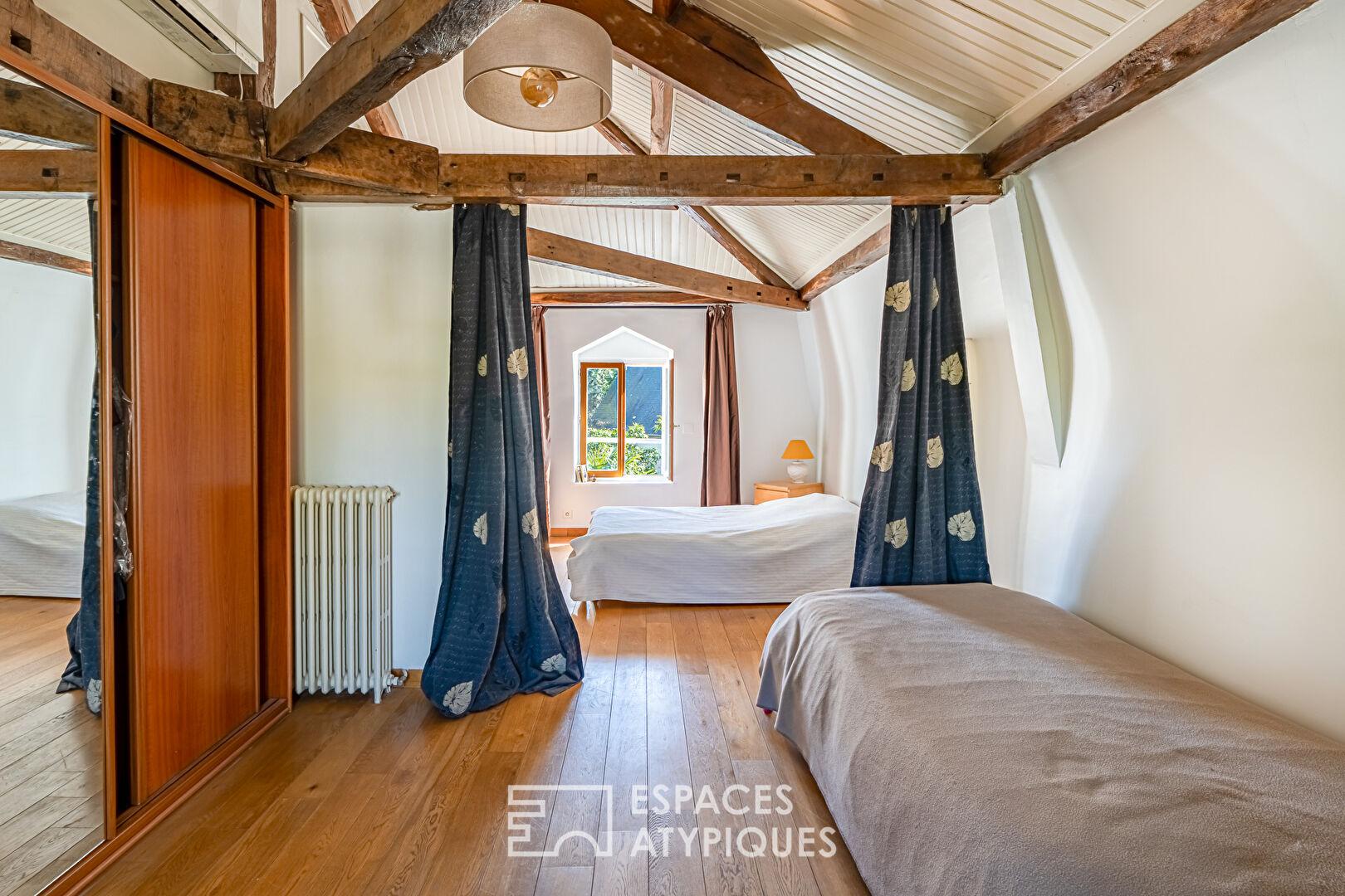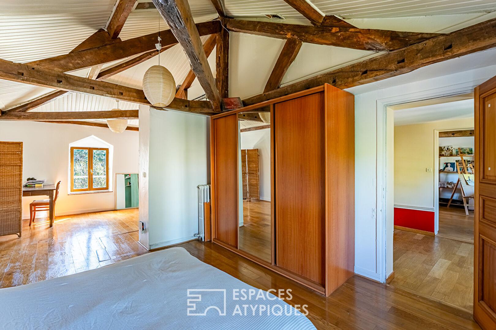 Le dernier étage dévoile un vaste plateau sous charpente apparente, aujourd’hui organisé en deux grandes chambres d’environ 30 m² chacune. Les volumes et la configuration permettent aisément d’envisager la création de quatre chambres, selon les besoins. Une salle d’eau centrale complète cet espace. Des combles accessibles viennent enrichir les possibilités de rangement.