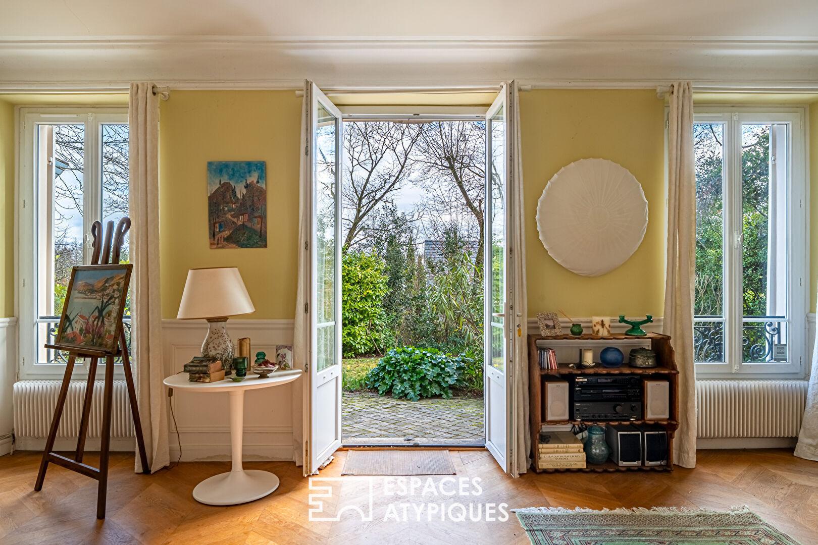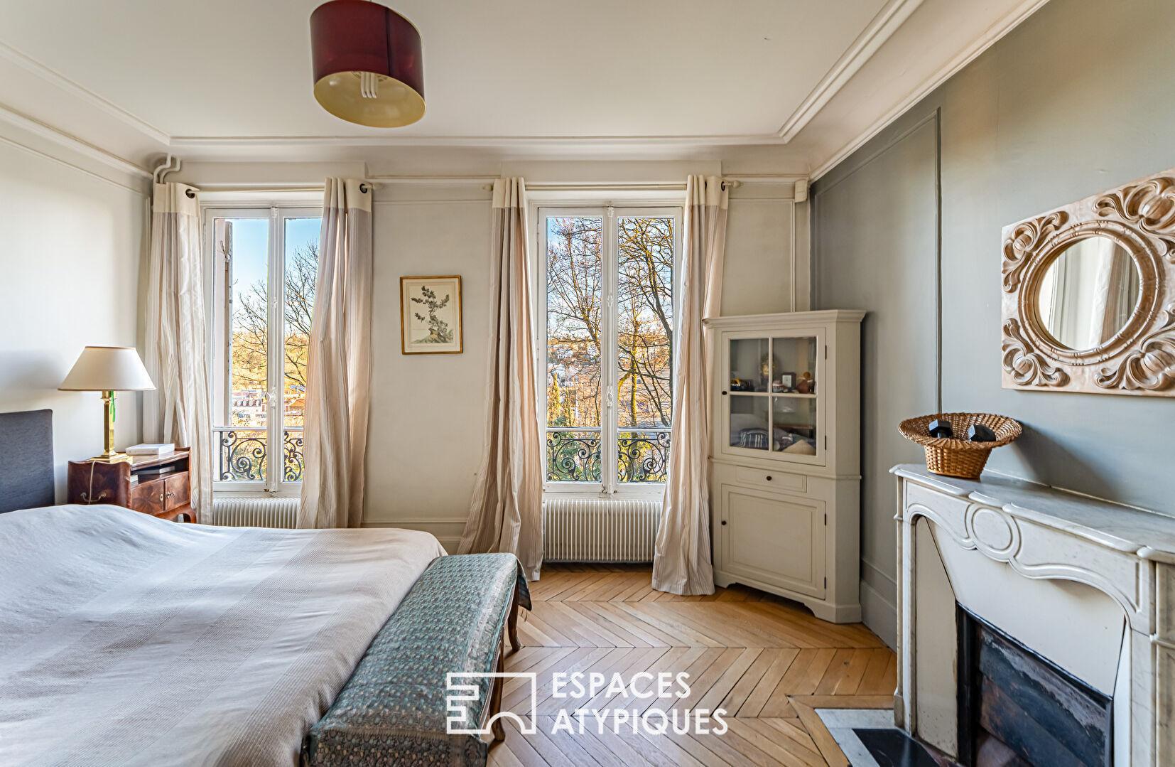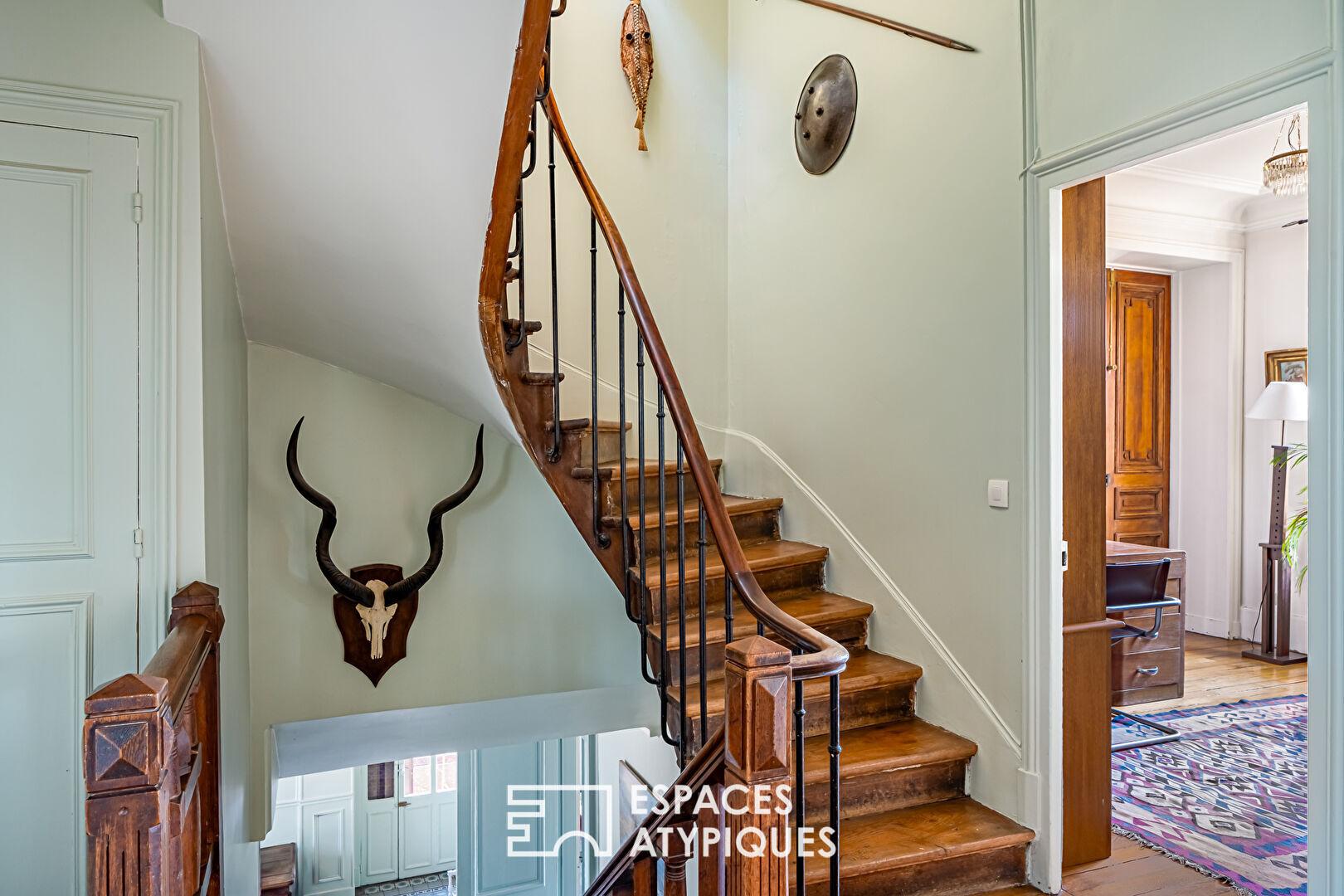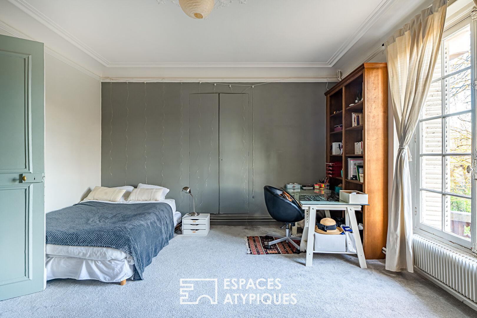 L’escalier, véritable colonne vertébrale de la maison, mène au premier étage où se déploie un vaste espace de vie familial : cuisine ouverte, salle à manger et salon composent un ensemble convivial et lumineux. Dans le prolongement, un bureau en enfilade conduit à un ancien salon de musique classique remarquablement préservé. Chargé d’histoire, ce lieu a autrefois accueilli d’illustres musiciens pour des concerts privés. Sa triple exposition lui offre aujourd’hui une lumière généreuse qui en fait une pièce de réception singulière.