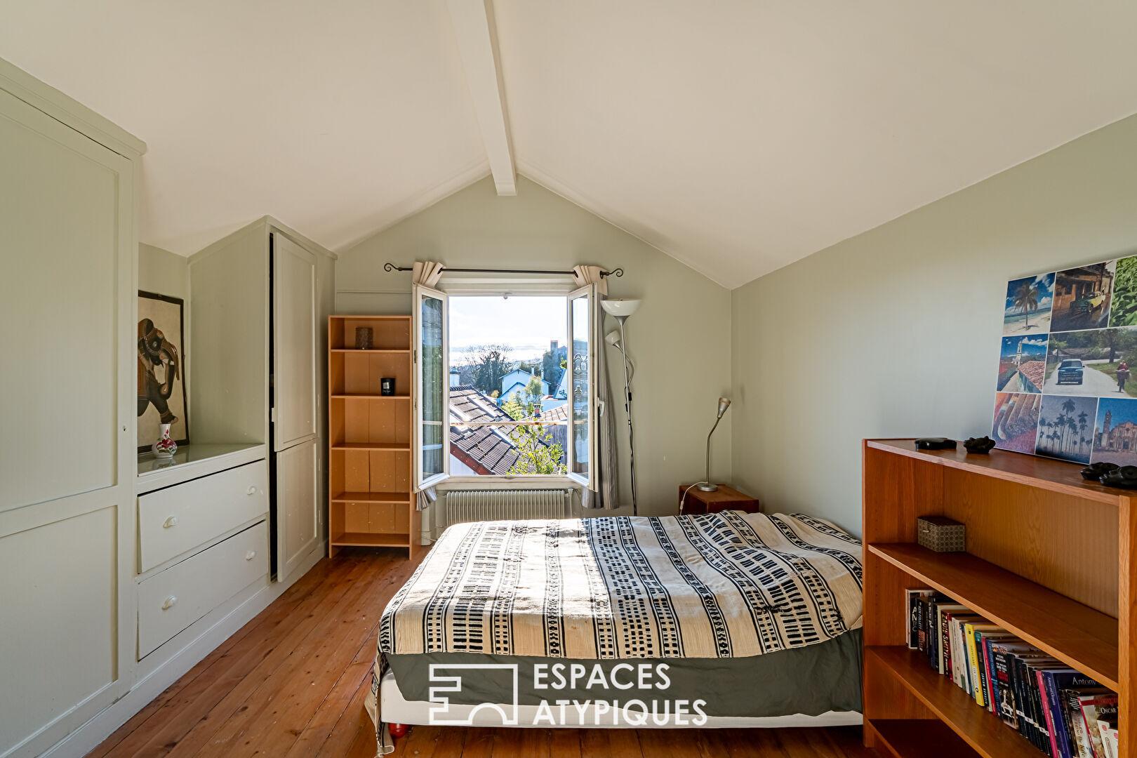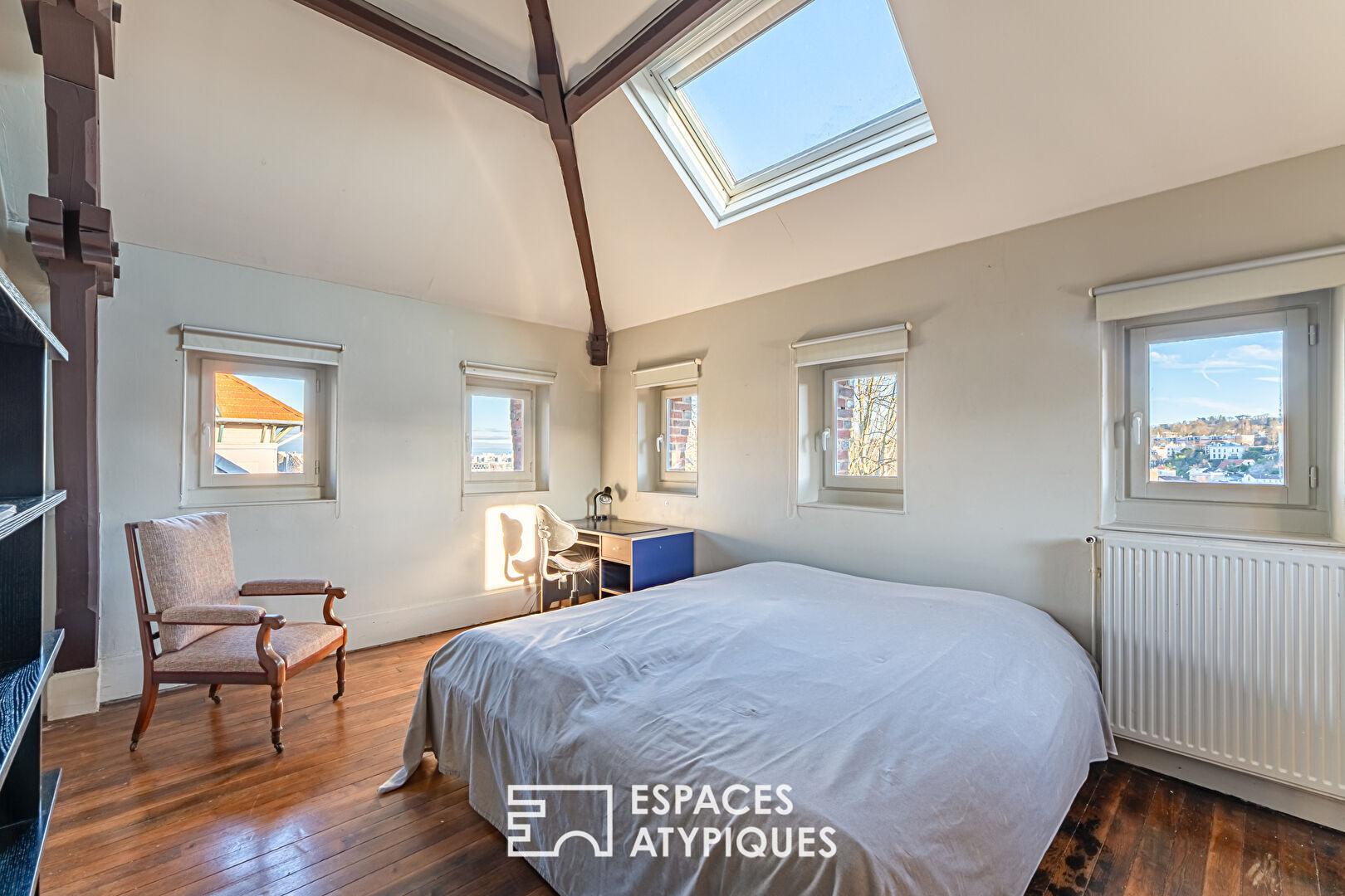 À un niveau intermédiaire se trouvent une chambre où règne le charme de l’intime, une salle de bain et de grands espaces de rangement. Le deuxième étage accueille trois chambres aux volumes remarquables. Deux d’entre elles, percées de multiples fenêtres sur trois expositions, évoquent presque l’atmosphère d’anciennes tours d’observation, ouvertes sur les paysages environnants.
